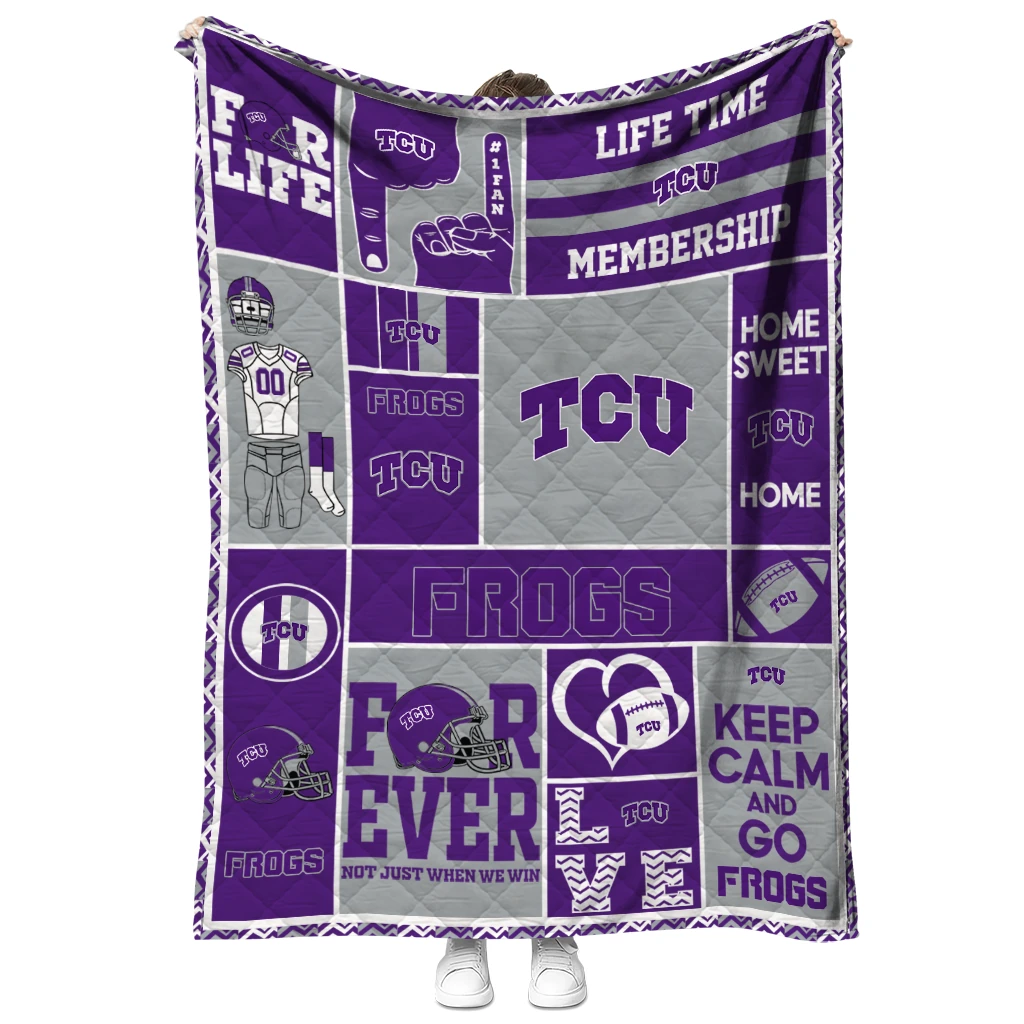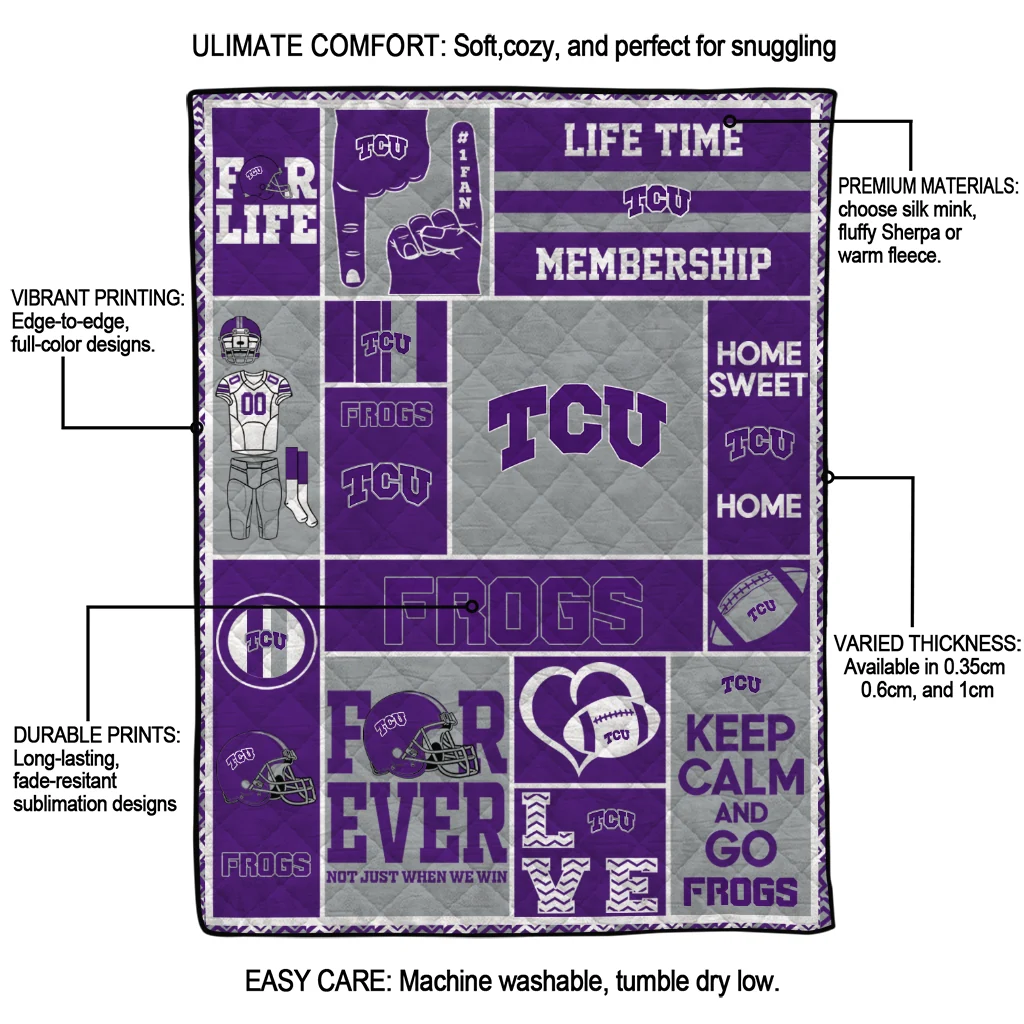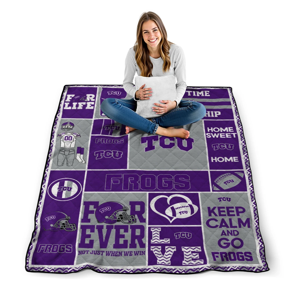 The Custom TCU Horned Frogs Helmet Passion Purple Quilt Blanket is more than a blanket—it’s everyday comfort, thoughtfully made. Crafted from premium quilting fabric with a soft microfiber touch, it offers a smooth hand-feel and lasting coziness. Layered quilting with a cotton-filled core provides adaptable warmth across seasons while maintaining a clean, tailored look on your bed or sofa.