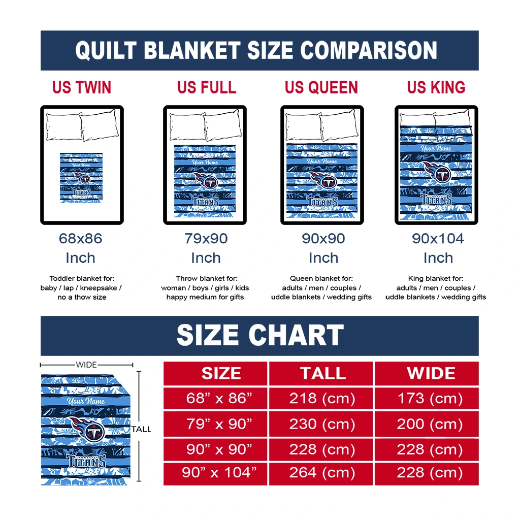 Wrap yourself in warmth and pride with the Custom Tennessee Titans Layered Florals Navy White Quilt Blanket from the Tennessee Titans Blankets collection at Yes That Blanket. Made from 100% premium quilting-weight polyester blended with a touch of microfiber, this quilt offers a smooth, soft finish you’ll love. Choose between two quilting styles—Stipple or Diagonal—and enjoy the comfort of a cotton-filled layer inside that adds extra coziness for every season. The border is available in classic black or white, giving your design a clean, timeless edge.