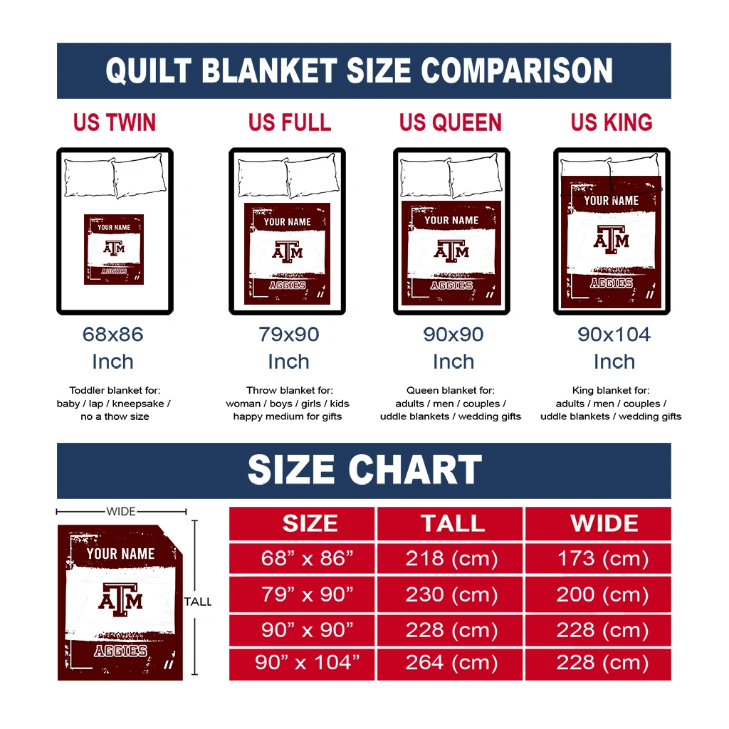 Wrap yourself in warmth and pride with the Custom Texas A&M Aggies Grunge Patch Maroon White Quilt Blanket from the Texas A&M Aggies Blankets collection at Yes That Blanket. Made from 100% premium quilting-weight polyester blended with a touch of microfiber, this quilt offers a smooth, soft finish you’ll love. Choose between two quilting styles—Stipple or Diagonal—and enjoy the comfort of a cotton-filled layer inside that adds extra coziness for every season. The border is available in classic black or white, giving your design a clean, timeless edge.