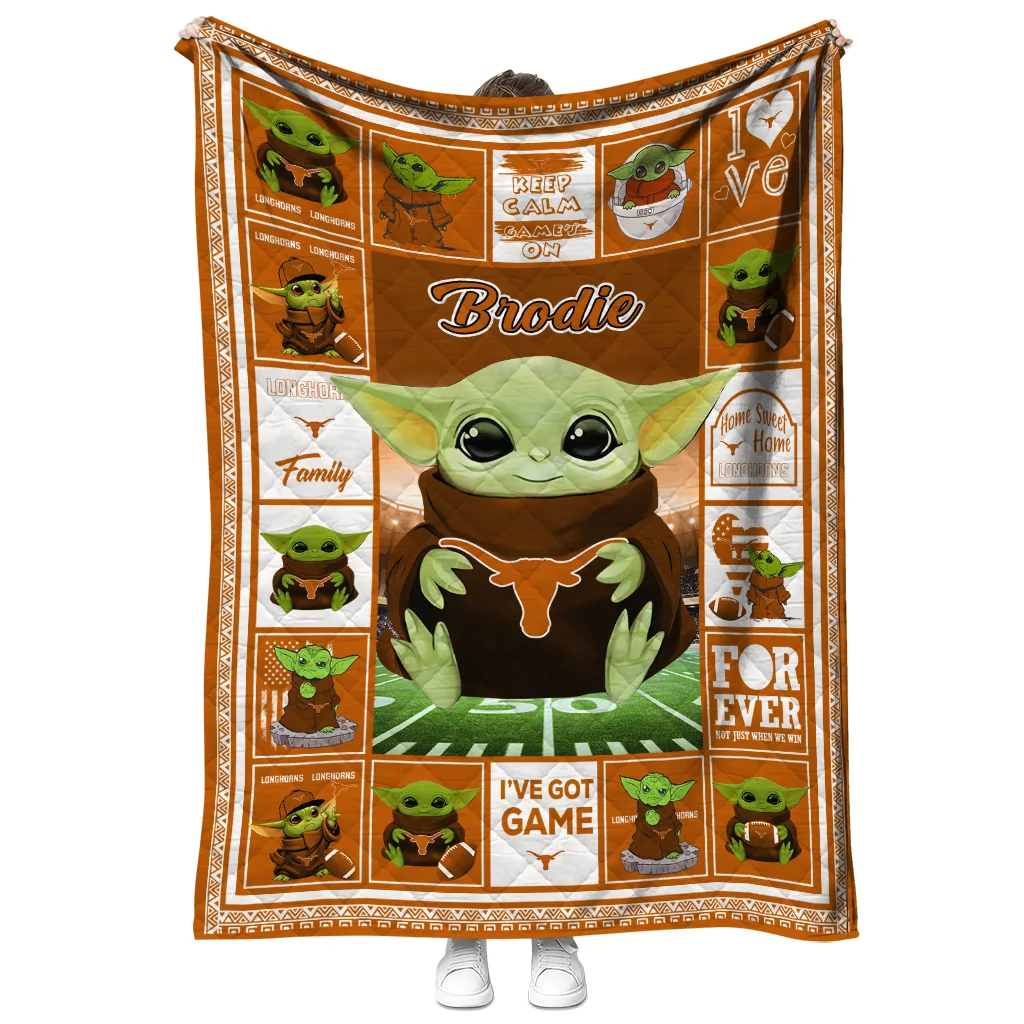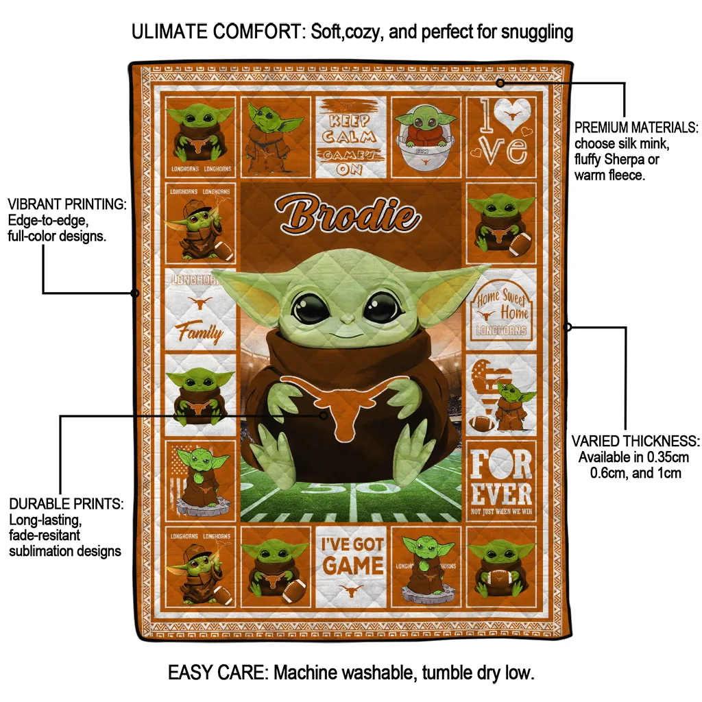 The Custom Texas Longhorns Yody Baby Pattern Orange Quilt Blanket is more than a blanket—it’s everyday comfort, thoughtfully made. Crafted from premium quilting fabric with a soft microfiber touch, it offers a smooth hand-feel and lasting coziness. Layered quilting with a cotton-filled core provides adaptable warmth across seasons while maintaining a clean, tailored look on your bed or sofa.