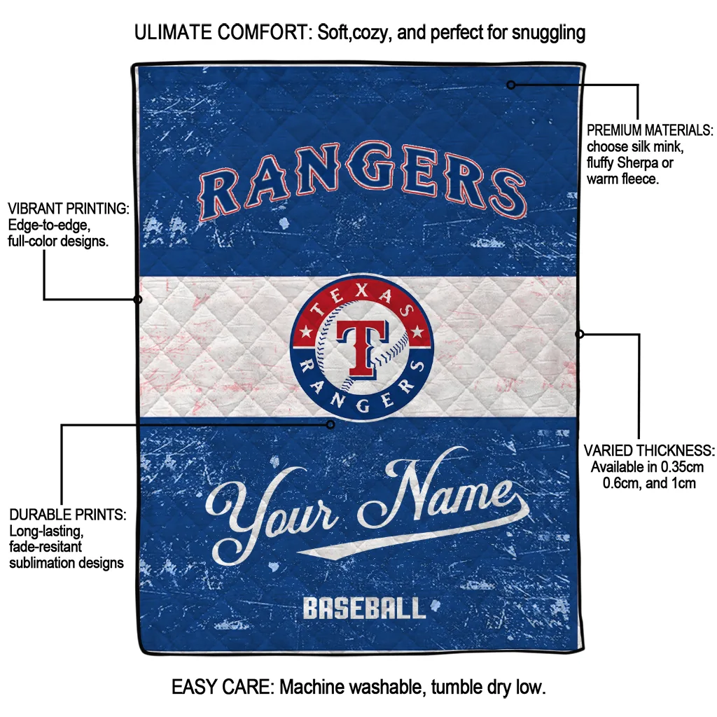 Wrap yourself in warmth and pride with the Custom Texas Rangers Snoopy Victory Blue White Quilt Blanket from the Texas Rangers Blankets collection at Yes That Blanket. Made from 100% premium quilting-weight polyester blended with a touch of microfiber, this quilt offers a smooth, soft finish you’ll love. Choose between two quilting styles—Stipple or Diagonal—and enjoy the comfort of a cotton-filled layer inside that adds extra coziness for every season. The border is available in classic black or white, giving your design a clean, timeless edge.