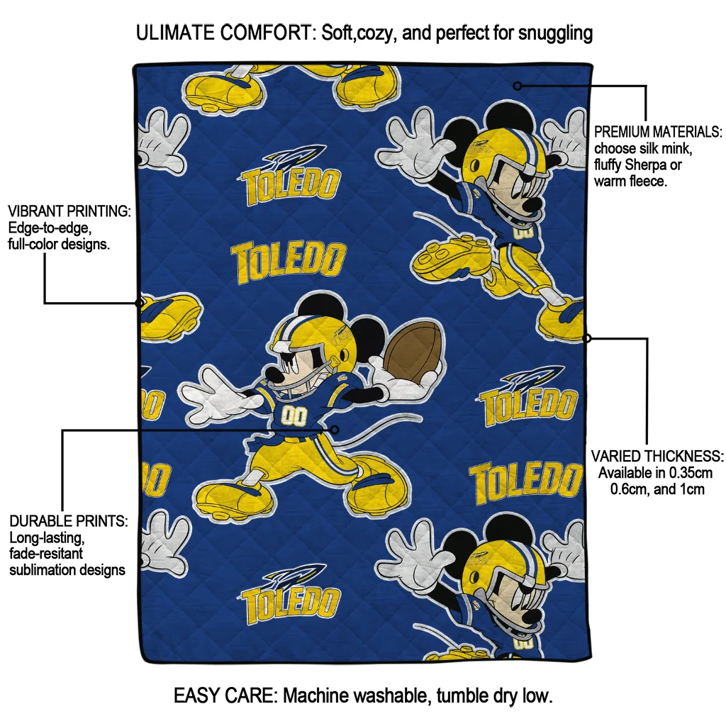 The Custom Toledo Rockets Mickey Football Blue Quilt Blanket is more than a blanket—it’s everyday comfort, thoughtfully made. Crafted from premium quilting fabric with a soft microfiber touch, it offers a smooth hand-feel and lasting coziness. Layered quilting with a cotton-filled core provides adaptable warmth across seasons while maintaining a clean, tailored look on your bed or sofa.