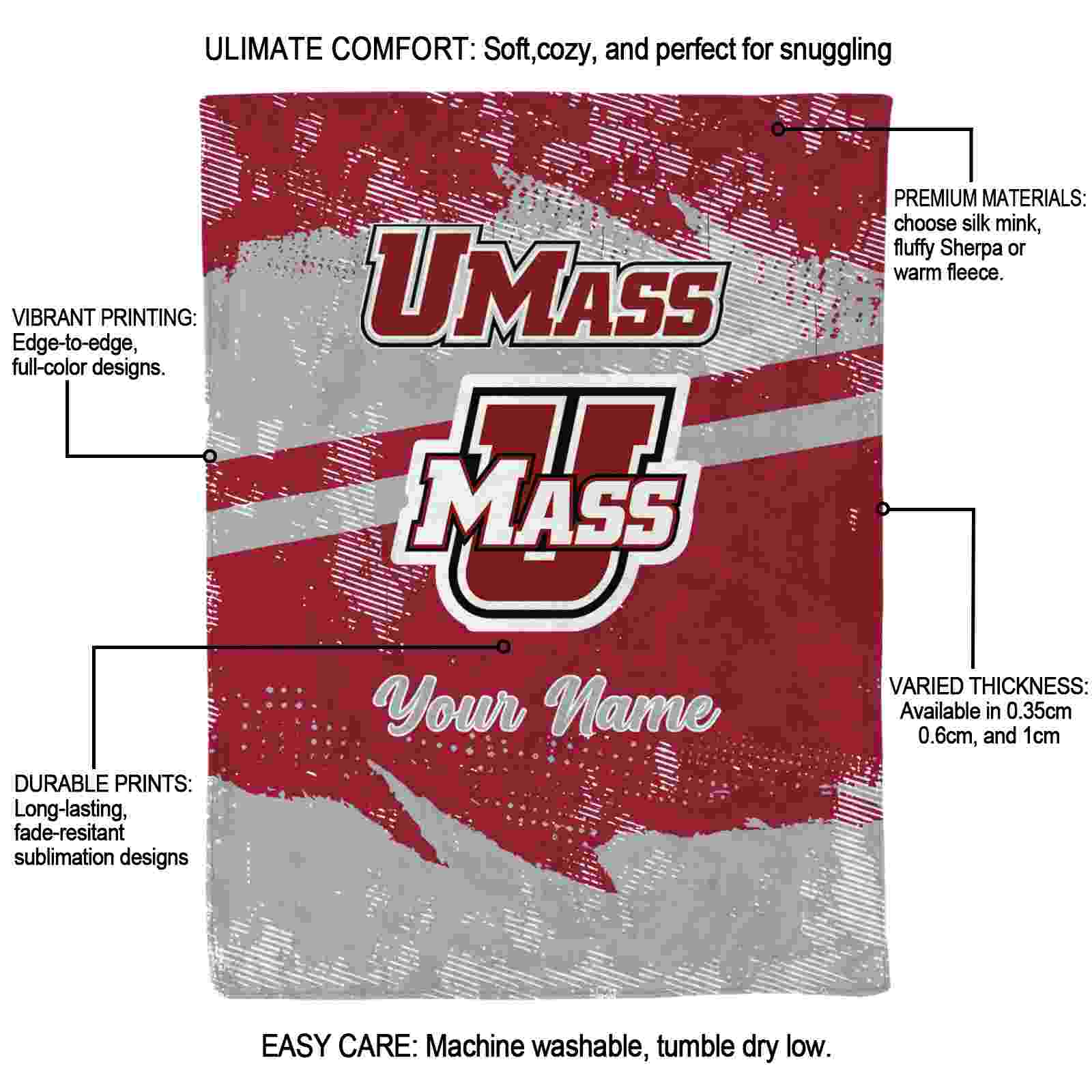 Without a doubt, the Custom UMass Minutemen Grunge Streaks Red Blanket from UMass Minutemen Blankets collection is offering true fans a chance to showcase passion in a cool way. Personalize it with your favorite team's logo or a meaningful name to make it uniquely yours. Isn't that great? The full-color print ensures vibrant, edge-to-edge designs, bringing your sports enthusiasm to life!