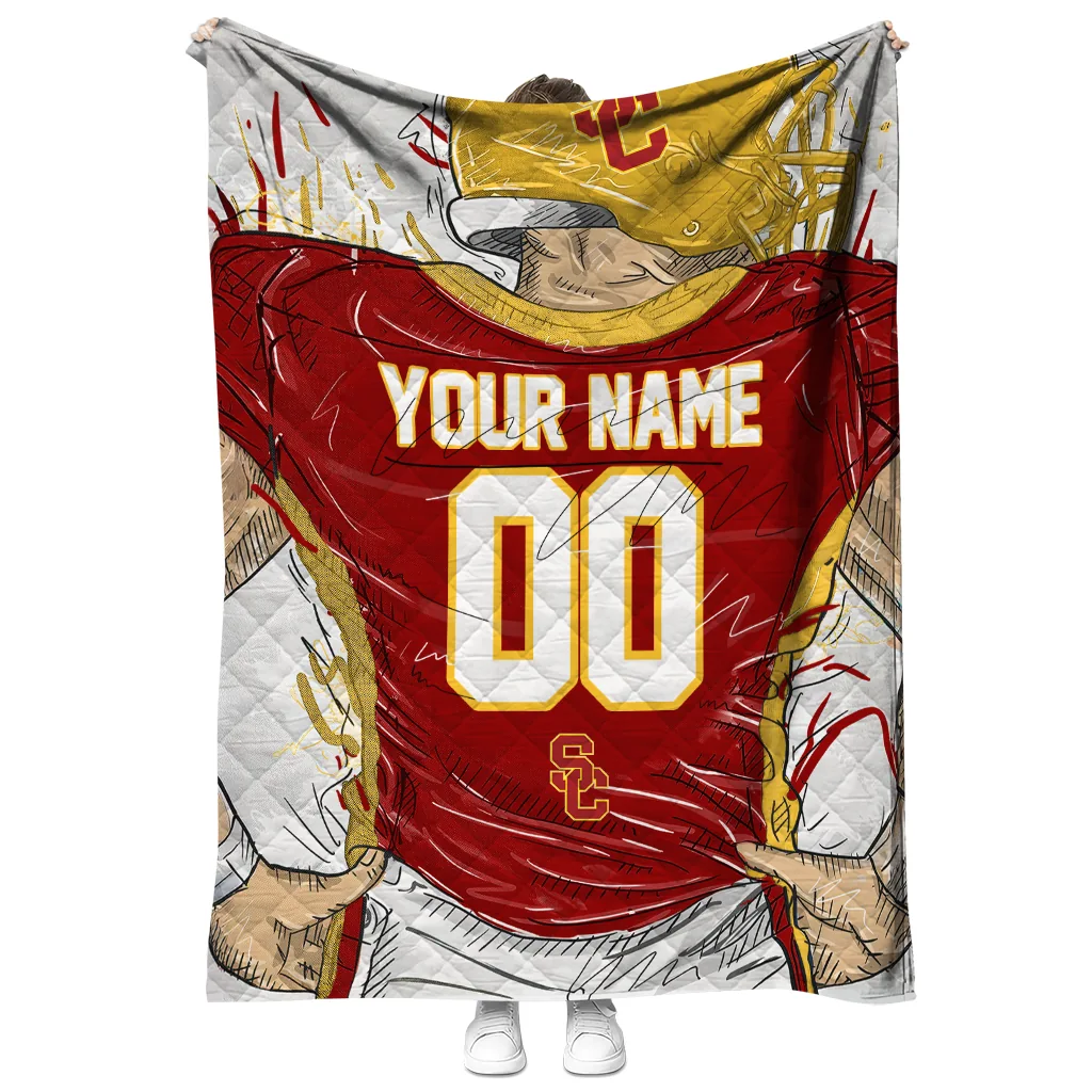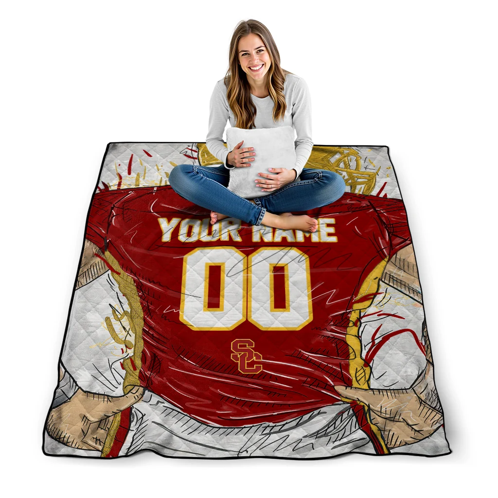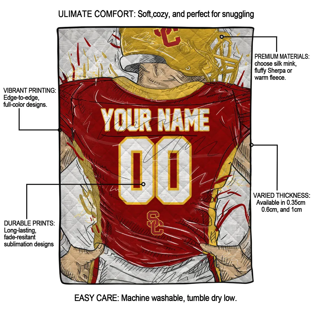 The Custom USC Trojans Player Sketch Red Gray Quilt Blanket is more than a blanket—it’s everyday comfort, thoughtfully made. Crafted from premium quilting fabric with a soft microfiber touch, it offers a smooth hand-feel and lasting coziness. Layered quilting with a cotton-filled core provides adaptable warmth across seasons while maintaining a clean, tailored look on your bed or sofa.