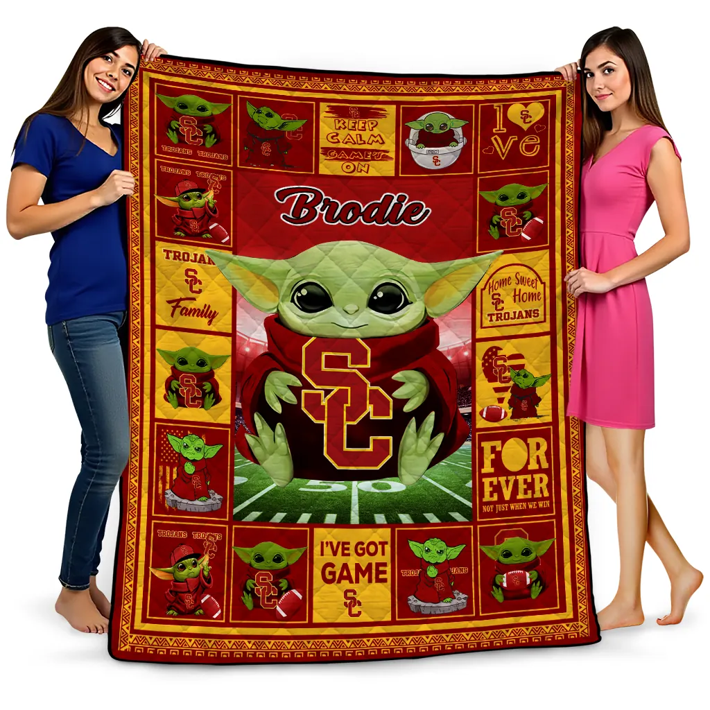 The Custom USC Trojans Yody Baby Pattern Red Quilt Blanket is more than a blanket—it’s everyday comfort, thoughtfully made. Crafted from premium quilting fabric with a soft microfiber touch, it offers a smooth hand-feel and lasting coziness. Layered quilting with a cotton-filled core provides adaptable warmth across seasons while maintaining a clean, tailored look on your bed or sofa.