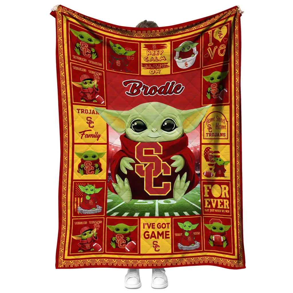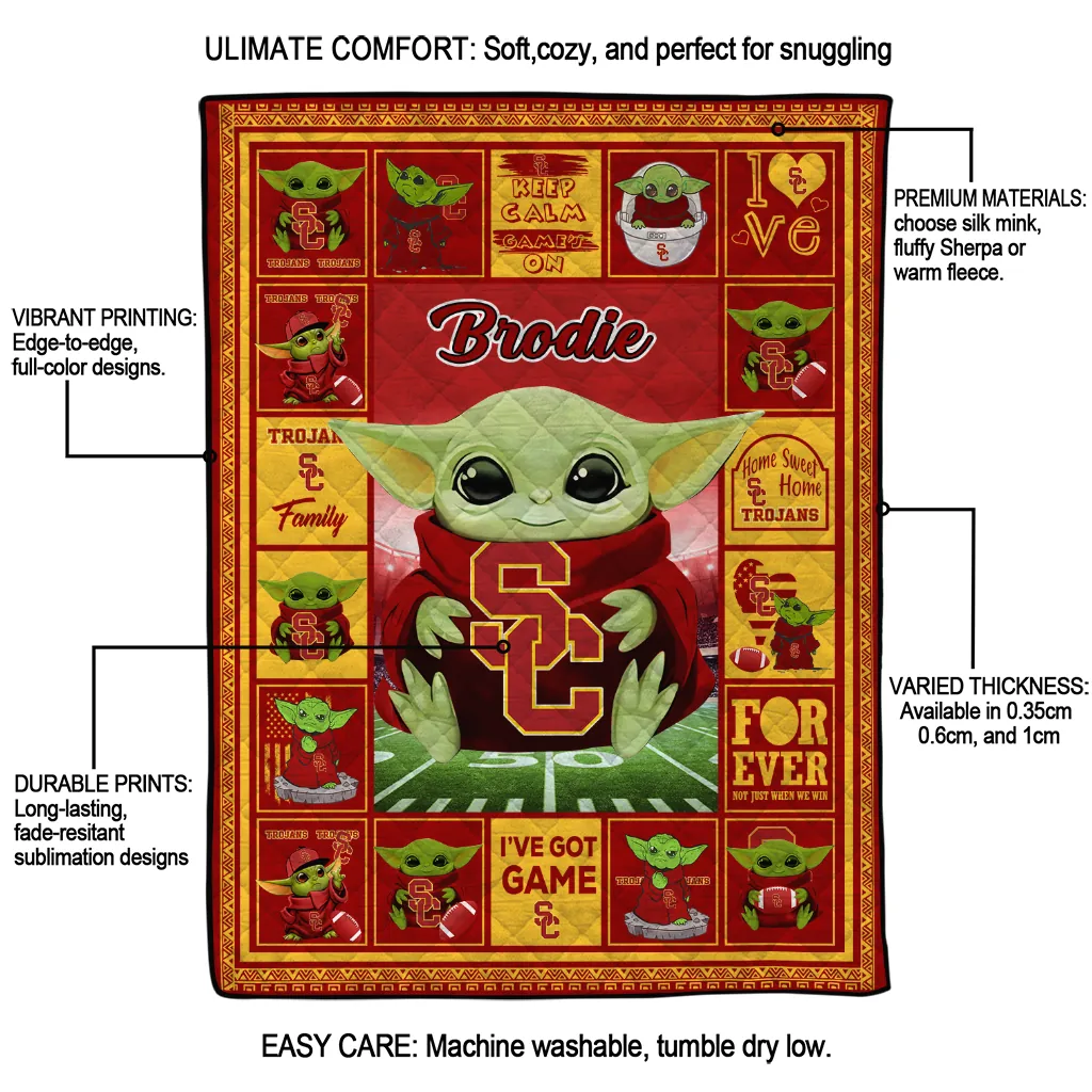 Wrap yourself in warmth and pride with the Custom USC Trojans Yody Baby Pattern Red Quilt Blanket from the USC Trojans Blankets collection at Yes That Blanket. Made from 100% premium quilting-weight polyester blended with a touch of microfiber, this quilt offers a smooth, soft finish you’ll love. Choose between two quilting styles—Stipple or Diagonal—and enjoy the comfort of a cotton-filled layer inside that adds extra coziness for every season. The border is available in classic black or white, giving your design a clean, timeless edge.