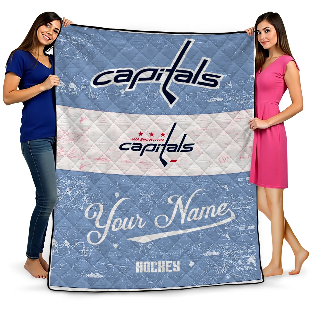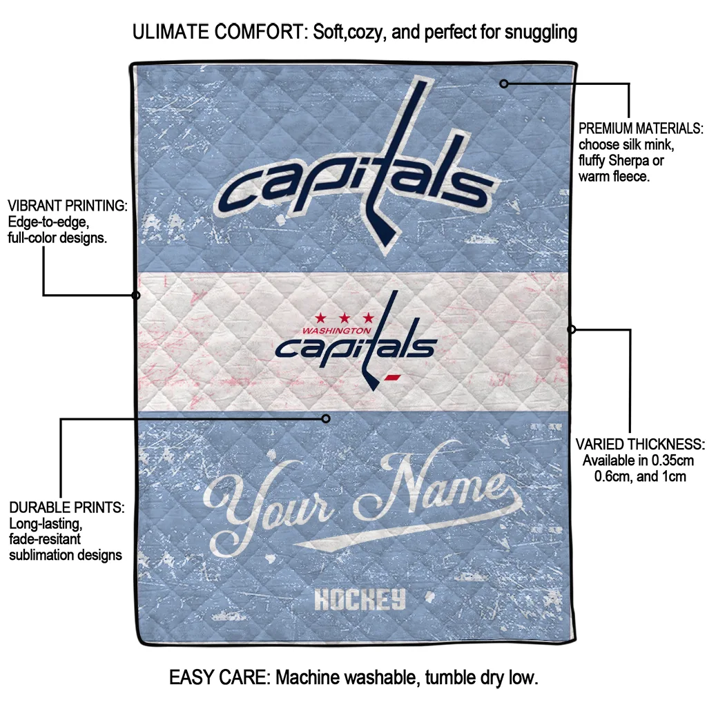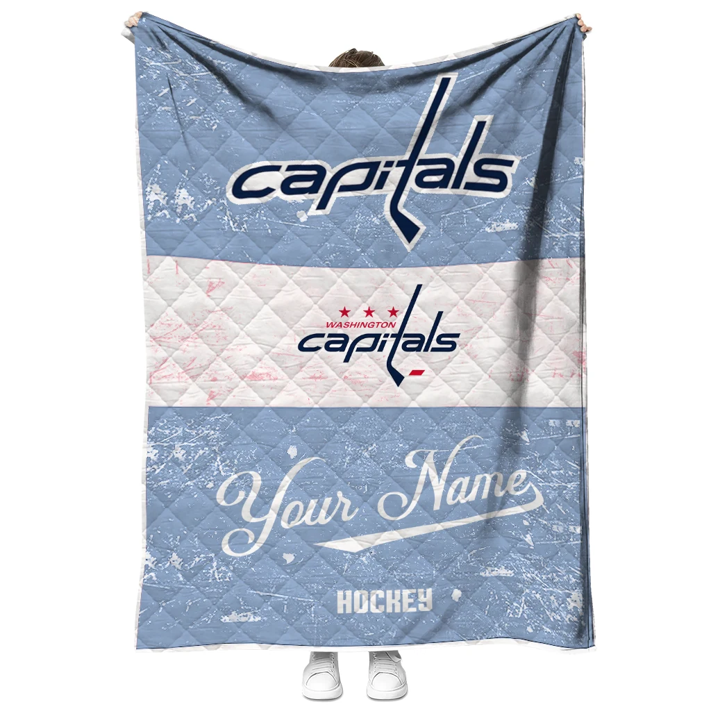 Wrap yourself in warmth and pride with the Custom Washington Capitals Pinstripe Lines Blue White Quilt Blanket from the Washington Capitals Blankets collection at Yes That Blanket. Made from 100% premium quilting-weight polyester blended with a touch of microfiber, this quilt offers a smooth, soft finish you’ll love. Choose between two quilting styles—Stipple or Diagonal—and enjoy the comfort of a cotton-filled layer inside that adds extra coziness for every season. The border is available in classic black or white, giving your design a clean, timeless edge.