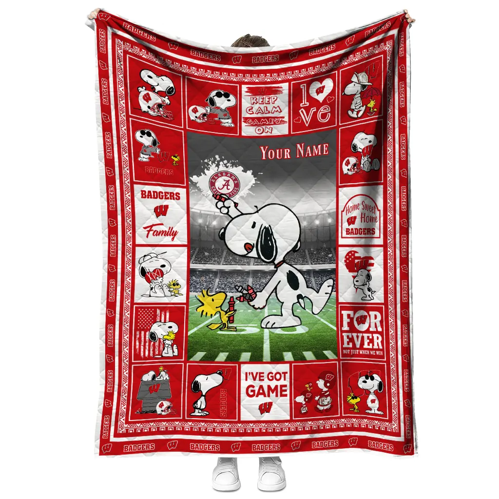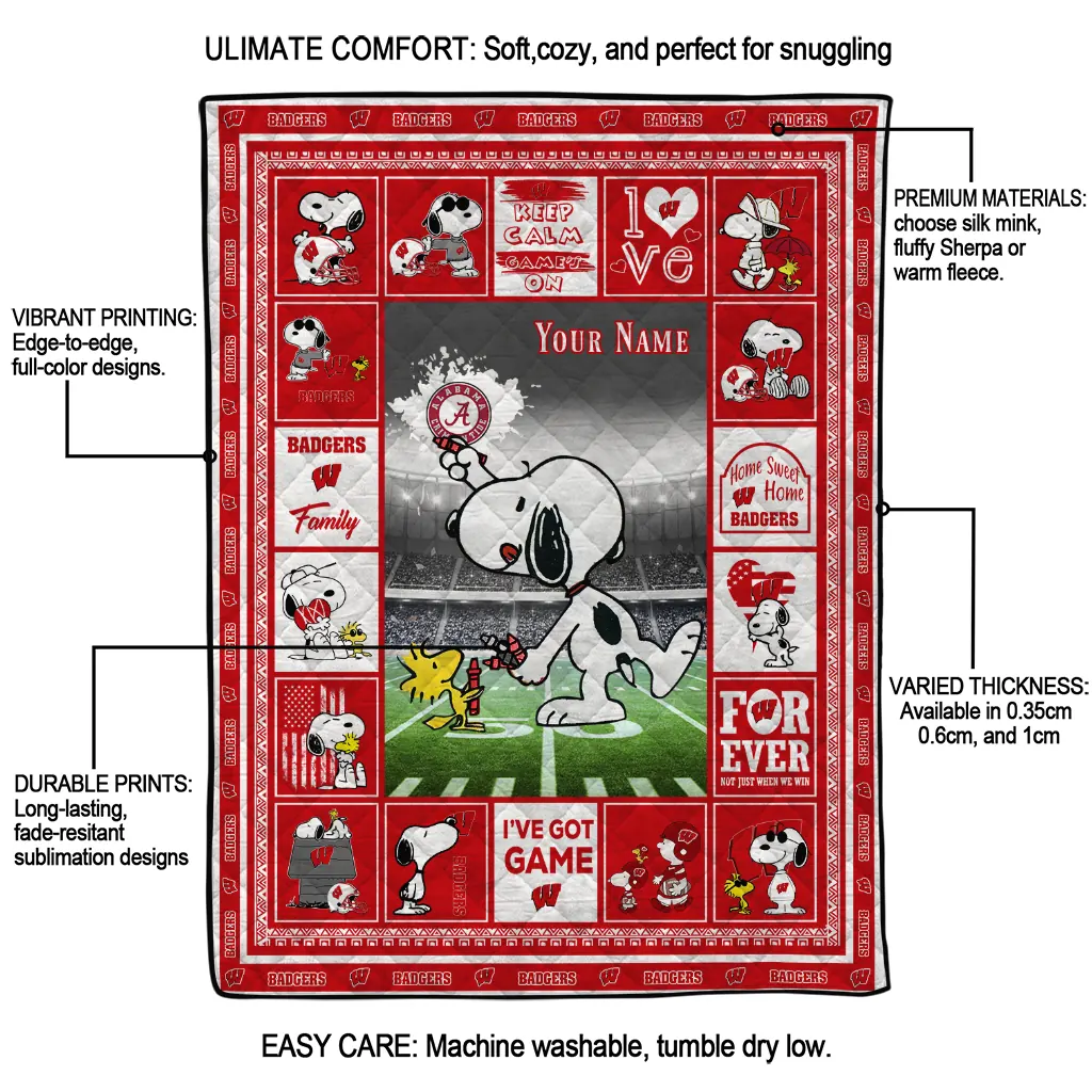 Wrap yourself in warmth and pride with the Custom Wisconsin Badgers Snoopy Coach Red Quilt Blanket from the Wisconsin Badgers Blankets collection at Yes That Blanket. Made from 100% premium quilting-weight polyester blended with a touch of microfiber, this quilt offers a smooth, soft finish you’ll love. Choose between two quilting styles—Stipple or Diagonal—and enjoy the comfort of a cotton-filled layer inside that adds extra coziness for every season. The border is available in classic black or white, giving your design a clean, timeless edge.