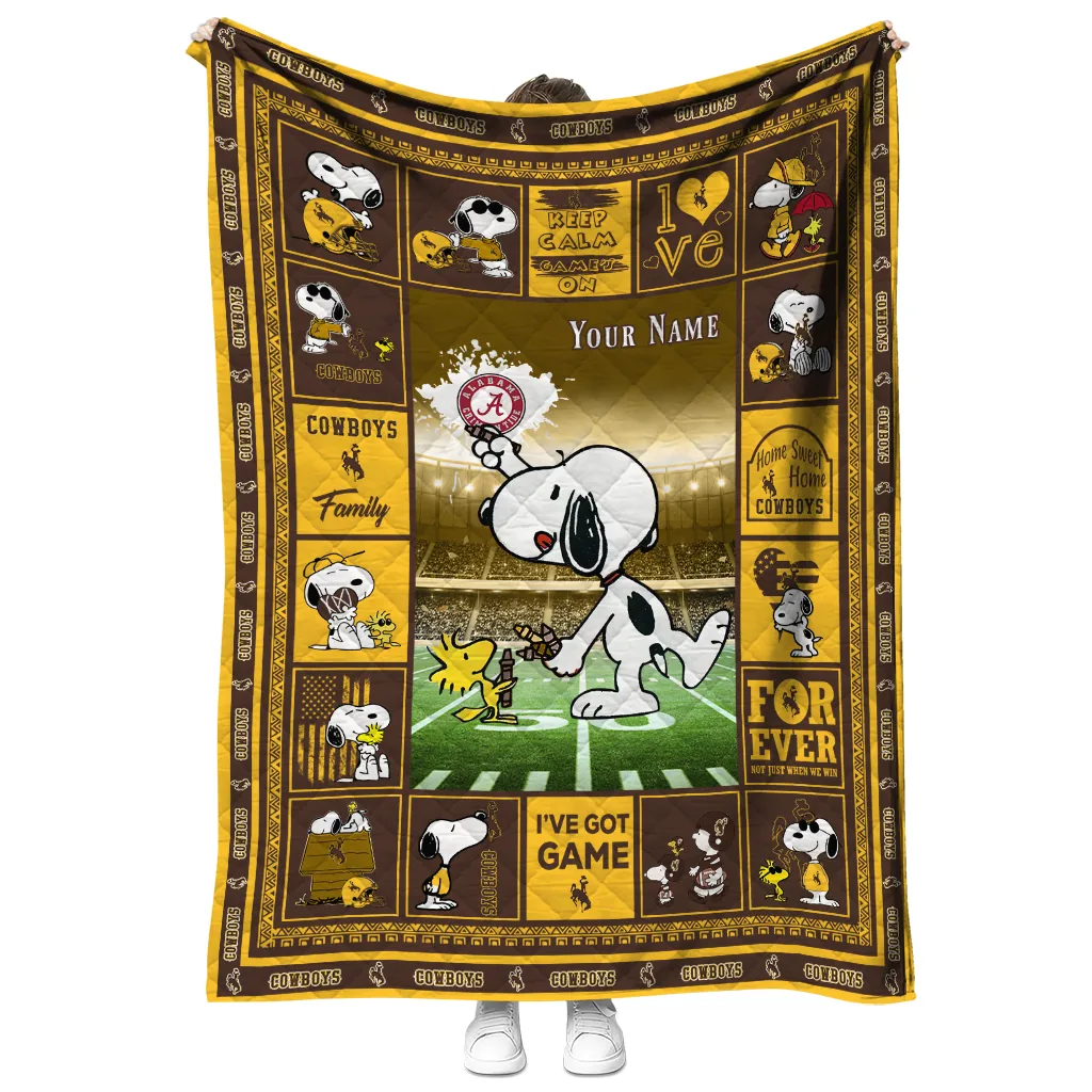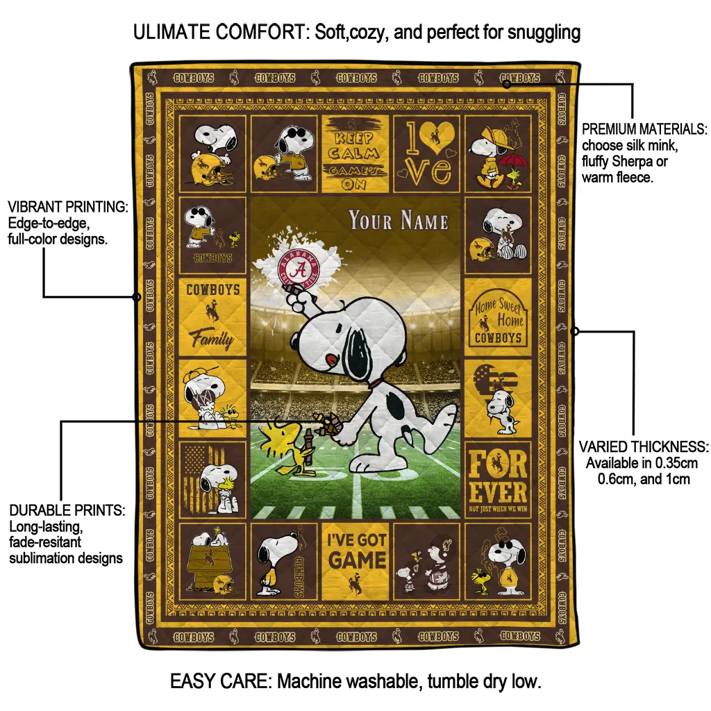 Wrap yourself in warmth and pride with the Custom Wyoming Cowboys Snoopy Coach Brown Quilt Blanket from the Wyoming Cowboys Blankets collection at Yes That Blanket. Made from 100% premium quilting-weight polyester blended with a touch of microfiber, this quilt offers a smooth, soft finish you’ll love. Choose between two quilting styles—Stipple or Diagonal—and enjoy the comfort of a cotton-filled layer inside that adds extra coziness for every season. The border is available in classic black or white, giving your design a clean, timeless edge.