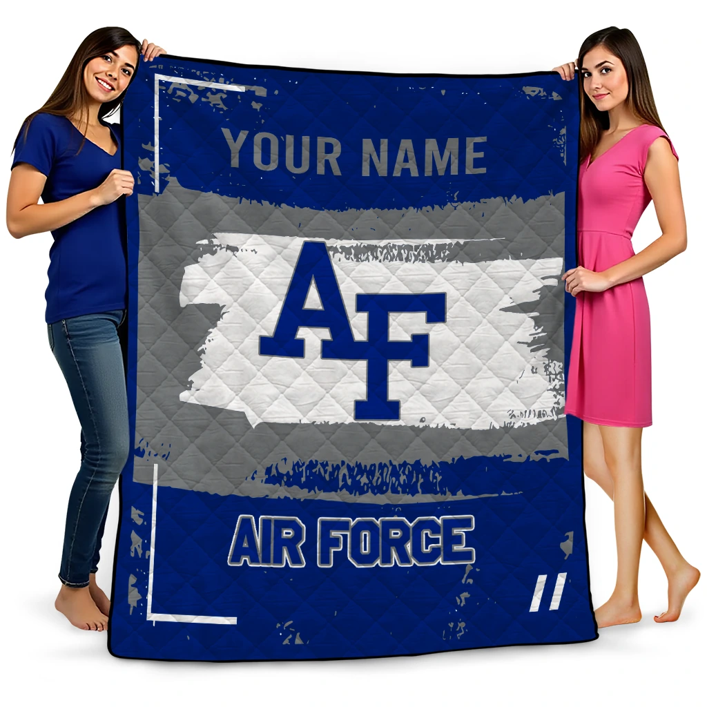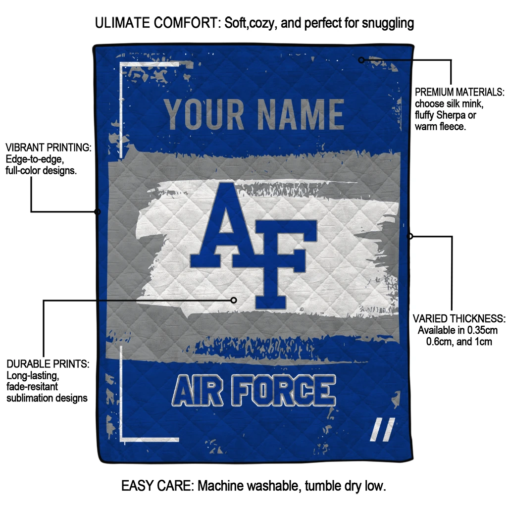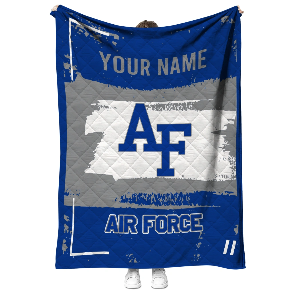 Wrap yourself in warmth and pride with the Customized Air Force Falcons Grunge Patch Blue White Quilt Blanket from the Air Force Falcons Blankets collection at Yes That Blanket. Made from 100% premium quilting-weight polyester blended with a touch of microfiber, this quilt offers a smooth, soft finish you’ll love. Choose between two quilting styles—Stipple or Diagonal—and enjoy the comfort of a cotton-filled layer inside that adds extra coziness for every season. The border is available in classic black or white, giving your design a clean, timeless edge.