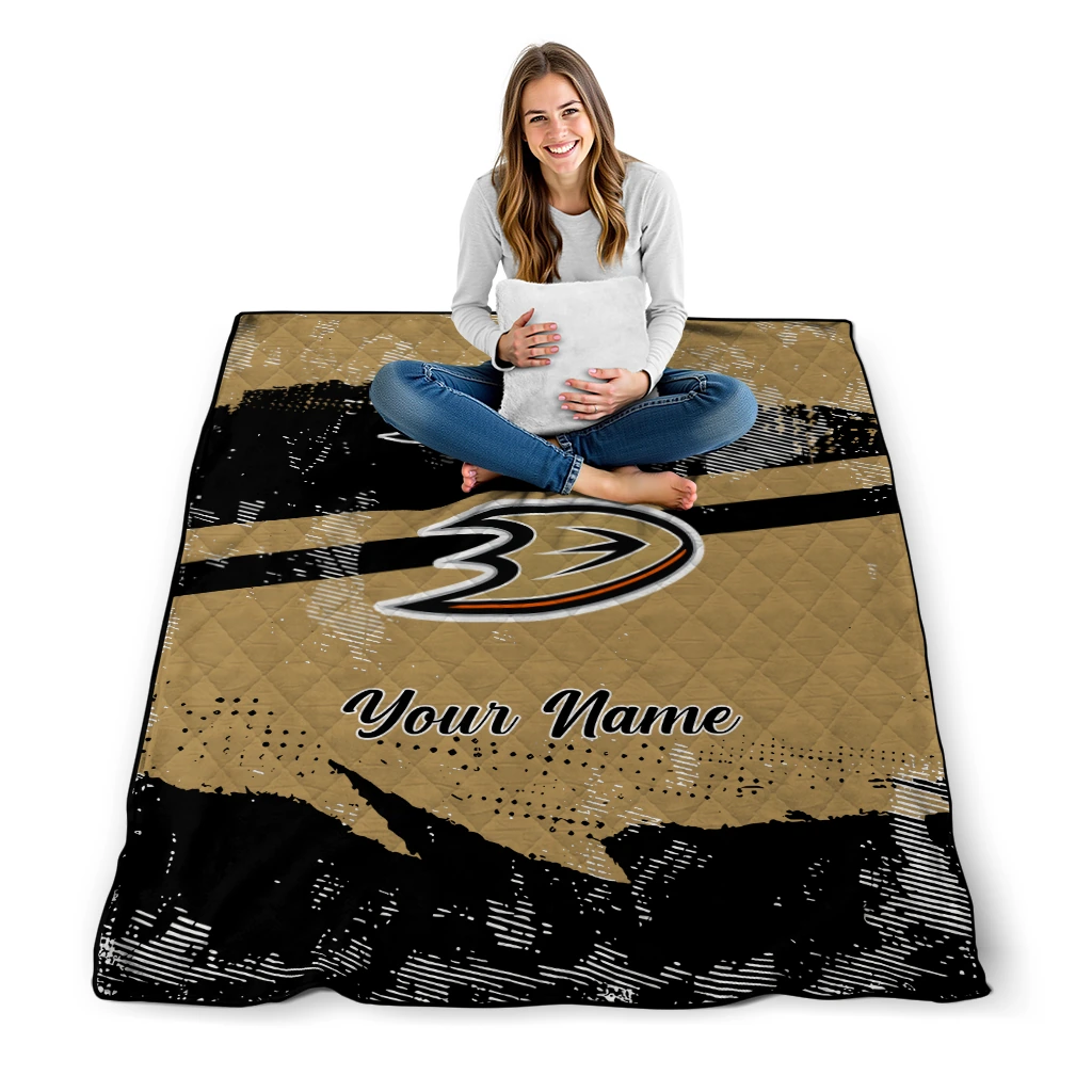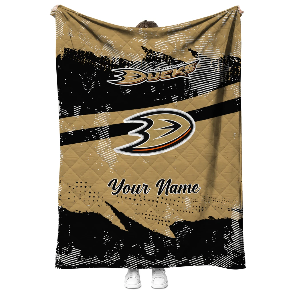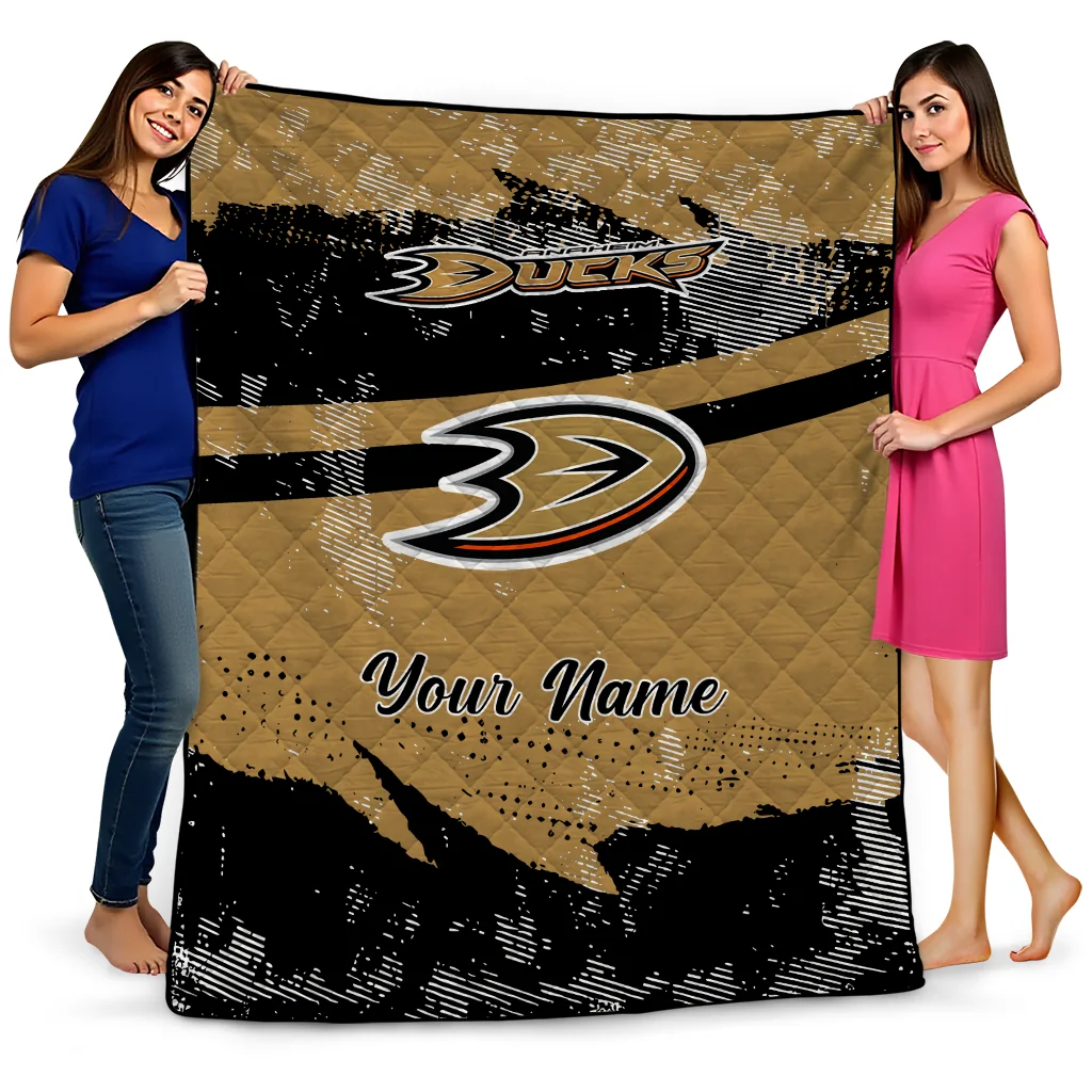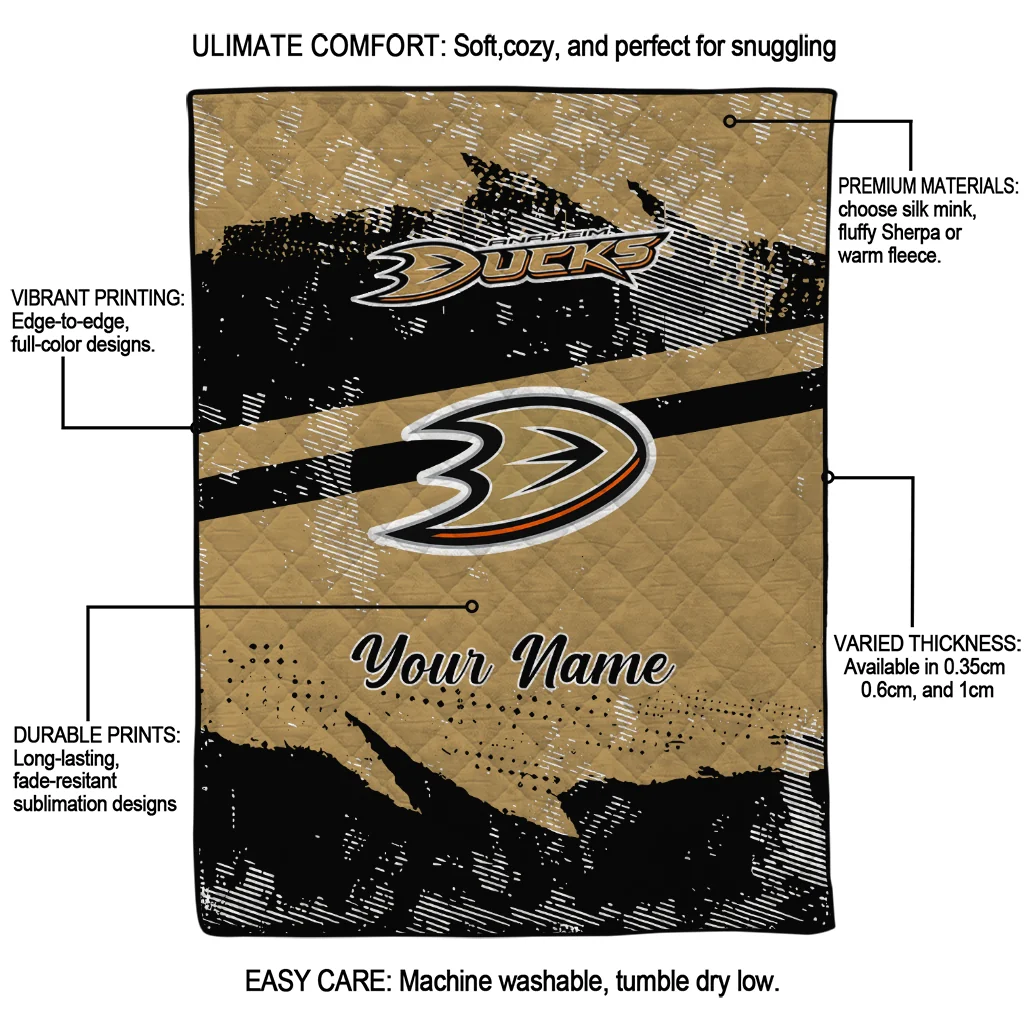 Wrap yourself in warmth and pride with the Customized Anaheim Ducks Brushstroke Layers Gold Quilt Blanket from the Anaheim Ducks Blankets collection at Yes That Blanket. Made from 100% premium quilting-weight polyester blended with a touch of microfiber, this quilt offers a smooth, soft finish you’ll love. Choose between two quilting styles—Stipple or Diagonal—and enjoy the comfort of a cotton-filled layer inside that adds extra coziness for every season. The border is available in classic black or white, giving your design a clean, timeless edge.