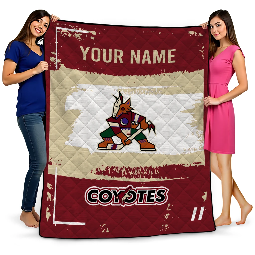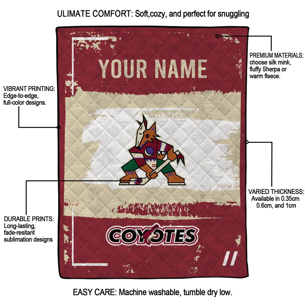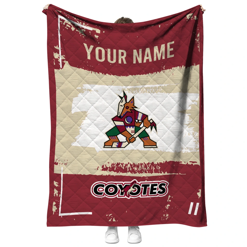 Wrap yourself in warmth and pride with the Customized Arizona Coyotes Grunge Patch Red White Quilt Blanket from the Arizona Coyotes Blankets collection at Yes That Blanket. Made from 100% premium quilting-weight polyester blended with a touch of microfiber, this quilt offers a smooth, soft finish you’ll love. Choose between two quilting styles—Stipple or Diagonal—and enjoy the comfort of a cotton-filled layer inside that adds extra coziness for every season. The border is available in classic black or white, giving your design a clean, timeless edge.