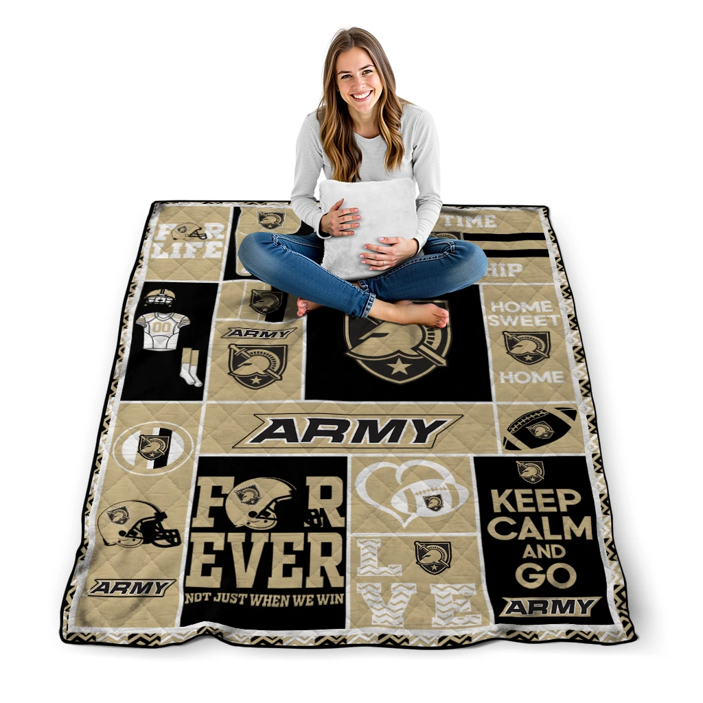 Wrap yourself in warmth and pride with the Customized Army Black Knights Helmet Passion Gold Quilt Blanket from the Army Black Knights Blankets collection at Yes That Blanket. Made from 100% premium quilting-weight polyester blended with a touch of microfiber, this quilt offers a smooth, soft finish you’ll love. Choose between two quilting styles—Stipple or Diagonal—and enjoy the comfort of a cotton-filled layer inside that adds extra coziness for every season. The border is available in classic black or white, giving your design a clean, timeless edge.