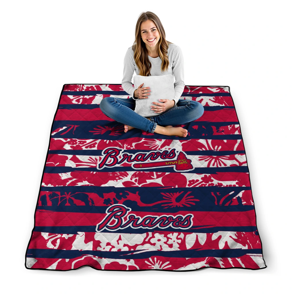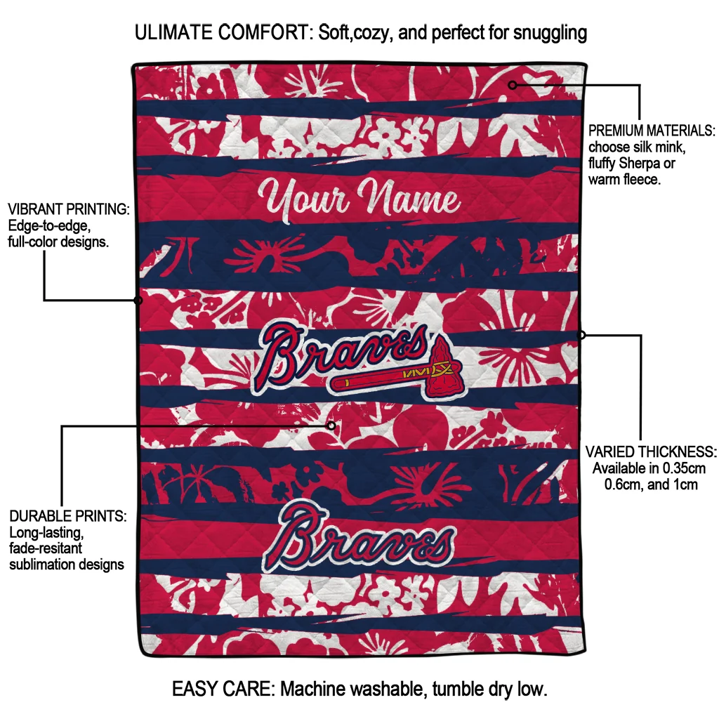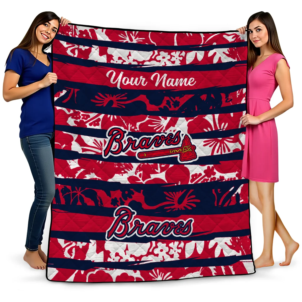 Customized Atlanta Braves Layered Florals Navy White Quilt Blanket
