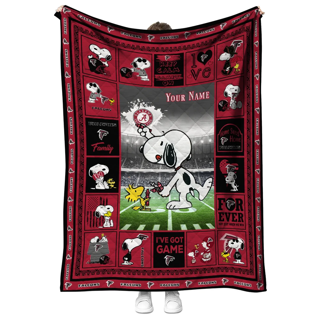 Wrap yourself in warmth and pride with the Customized Atlanta Falcons Snoopy Coach Red Quilt Blanket from the Atlanta Falcons Blankets collection at Yes That Blanket. Made from 100% premium quilting-weight polyester blended with a touch of microfiber, this quilt offers a smooth, soft finish you’ll love. Choose between two quilting styles—Stipple or Diagonal—and enjoy the comfort of a cotton-filled layer inside that adds extra coziness for every season. The border is available in classic black or white, giving your design a clean, timeless edge.