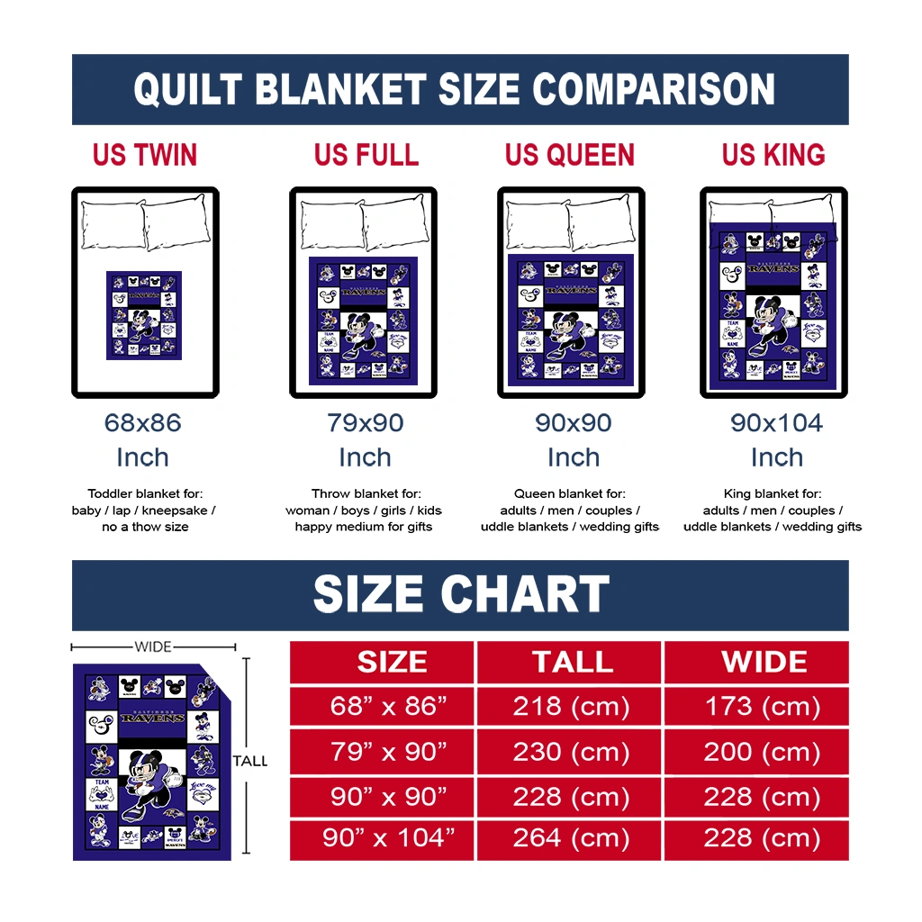 Wrap yourself in warmth and pride with the Customized Baltimore Ravens Mickey Crimson Purple White Quilt Blanket from the Baltimore Ravens Blankets collection at Yes That Blanket. Made from 100% premium quilting-weight polyester blended with a touch of microfiber, this quilt offers a smooth, soft finish you’ll love. Choose between two quilting styles—Stipple or Diagonal—and enjoy the comfort of a cotton-filled layer inside that adds extra coziness for every season. The border is available in classic black or white, giving your design a clean, timeless edge.