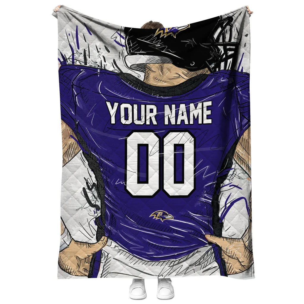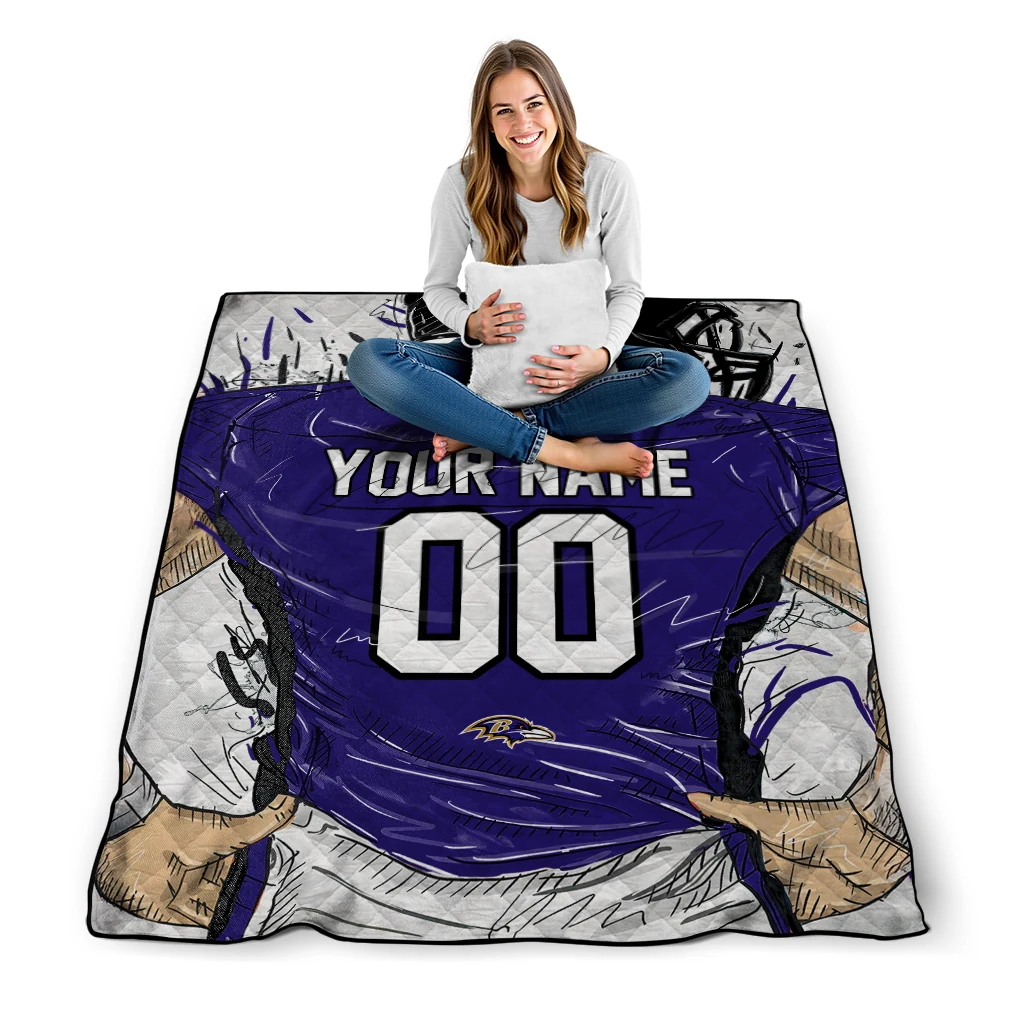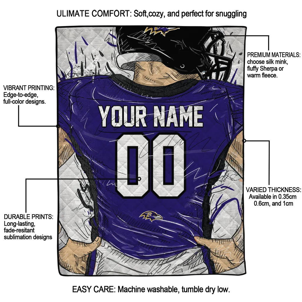 The Customized Baltimore Ravens Player Sketch Purple Gray Quilt Blanket is more than a blanket—it’s everyday comfort, thoughtfully made. Crafted from premium quilting fabric with a soft microfiber touch, it offers a smooth hand-feel and lasting coziness. Layered quilting with a cotton-filled core provides adaptable warmth across seasons while maintaining a clean, tailored look on your bed or sofa.