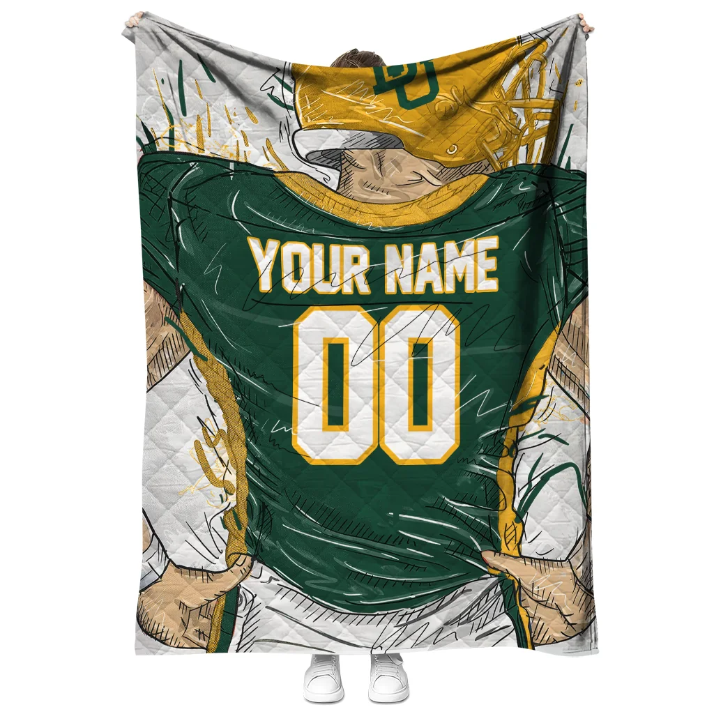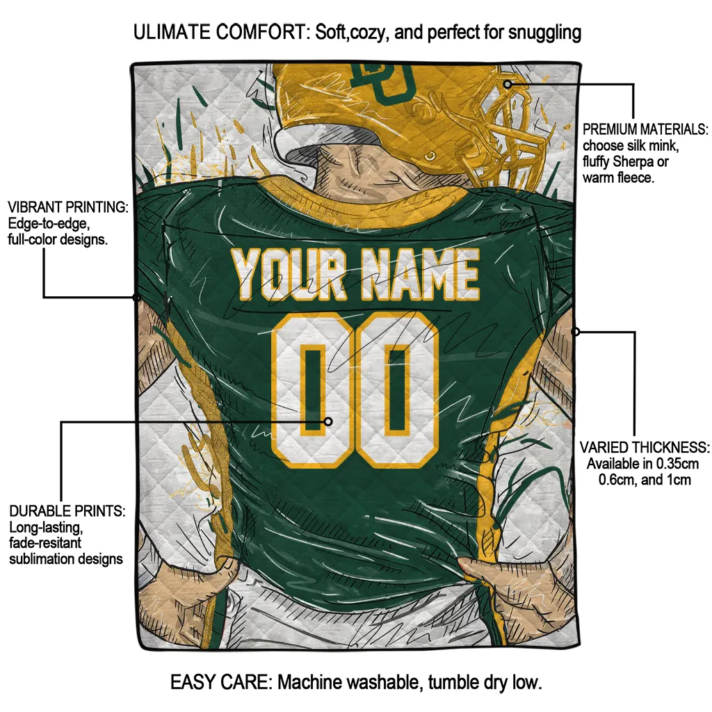 The Customized Baylor Bears Player Sketch Green Gray Quilt Blanket is more than a blanket—it’s everyday comfort, thoughtfully made. Crafted from premium quilting fabric with a soft microfiber touch, it offers a smooth hand-feel and lasting coziness. Layered quilting with a cotton-filled core provides adaptable warmth across seasons while maintaining a clean, tailored look on your bed or sofa.