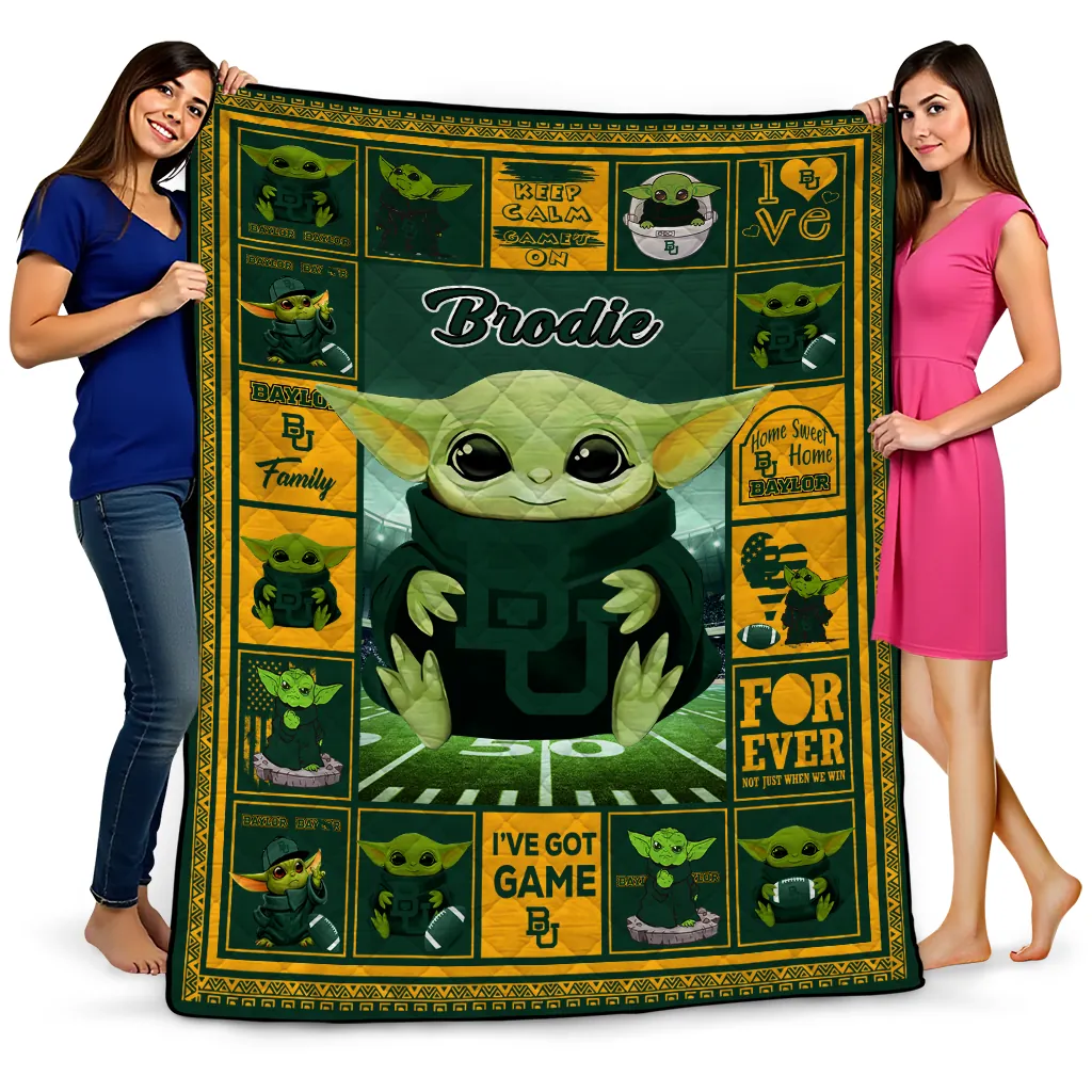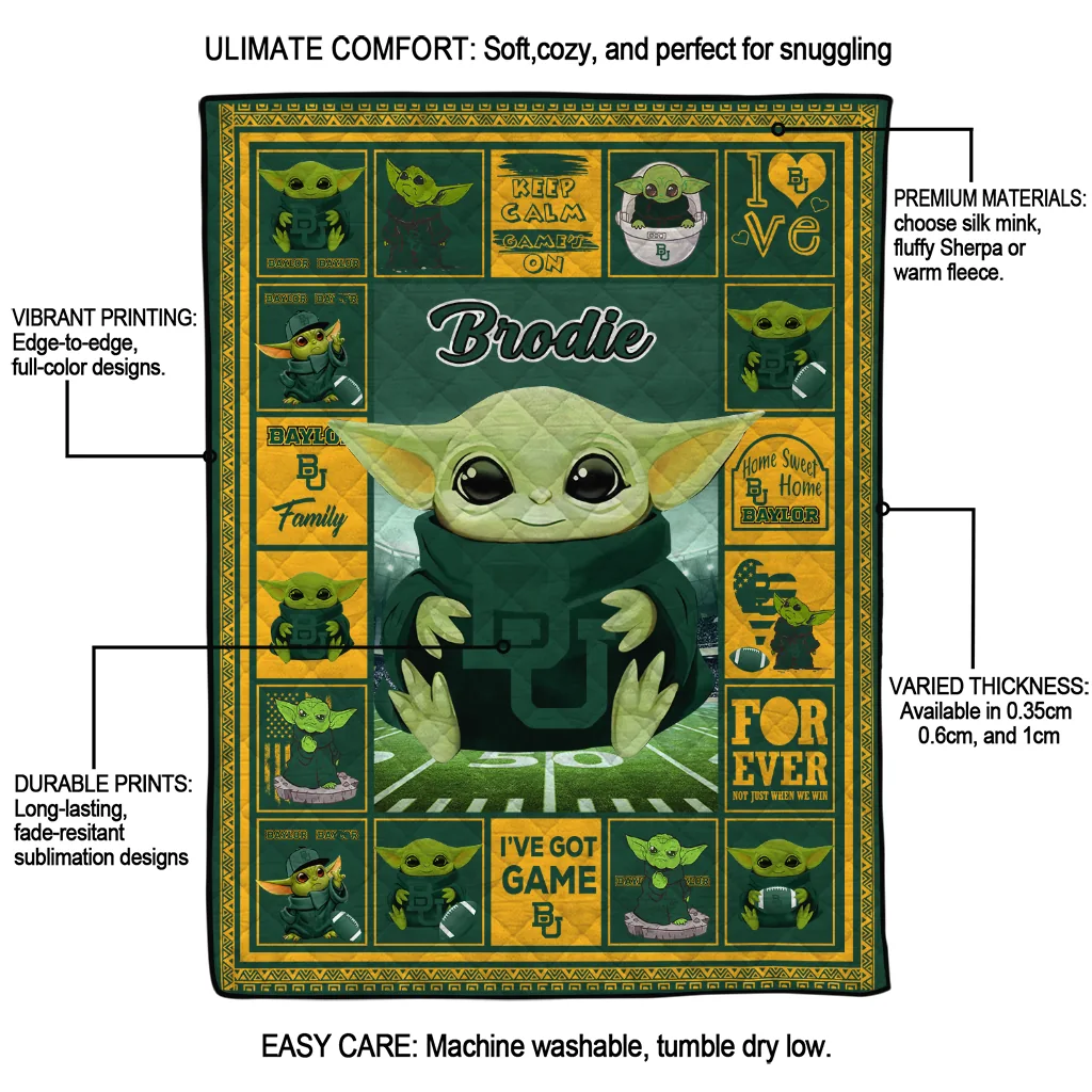 Wrap yourself in warmth and pride with the Customized Baylor Bears Yody Baby Pattern Green Quilt Blanket from the Baylor Bears Blankets collection at Yes That Blanket. Made from 100% premium quilting-weight polyester blended with a touch of microfiber, this quilt offers a smooth, soft finish you’ll love. Choose between two quilting styles—Stipple or Diagonal—and enjoy the comfort of a cotton-filled layer inside that adds extra coziness for every season. The border is available in classic black or white, giving your design a clean, timeless edge.