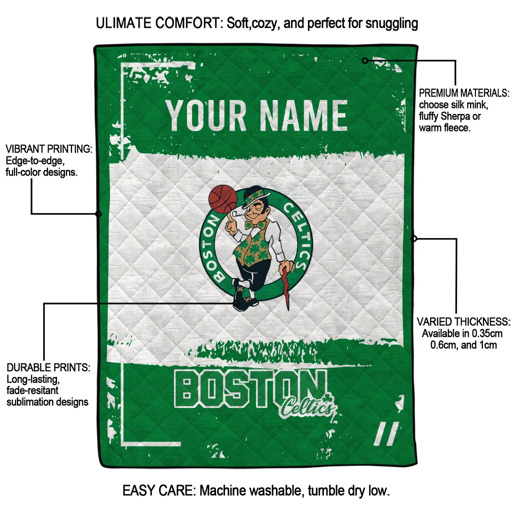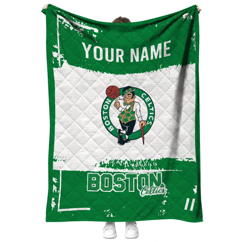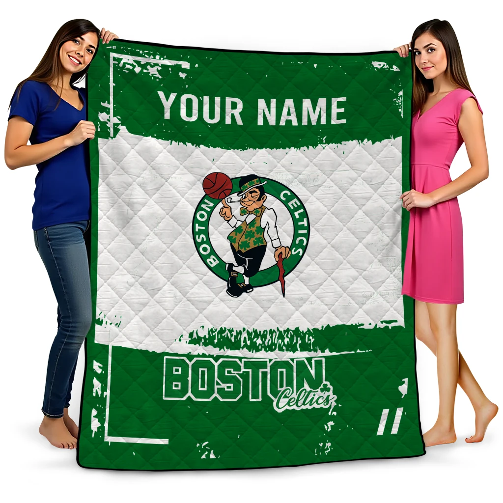 The Customized Boston Celtics Grunge Patch Green White Quilt Blanket is more than a blanket—it’s everyday comfort, thoughtfully made. Crafted from premium quilting fabric with a soft microfiber touch, it offers a smooth hand-feel and lasting coziness. Layered quilting with a cotton-filled core provides adaptable warmth across seasons while maintaining a clean, tailored look on your bed or sofa.