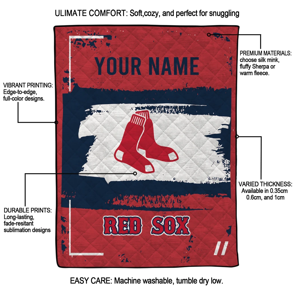 Wrap yourself in warmth and pride with the Customized Boston Red Sox Grunge Patch Red White Quilt Blanket from the Boston Red Sox Blankets collection at Yes That Blanket. Made from 100% premium quilting-weight polyester blended with a touch of microfiber, this quilt offers a smooth, soft finish you’ll love. Choose between two quilting styles—Stipple or Diagonal—and enjoy the comfort of a cotton-filled layer inside that adds extra coziness for every season. The border is available in classic black or white, giving your design a clean, timeless edge.