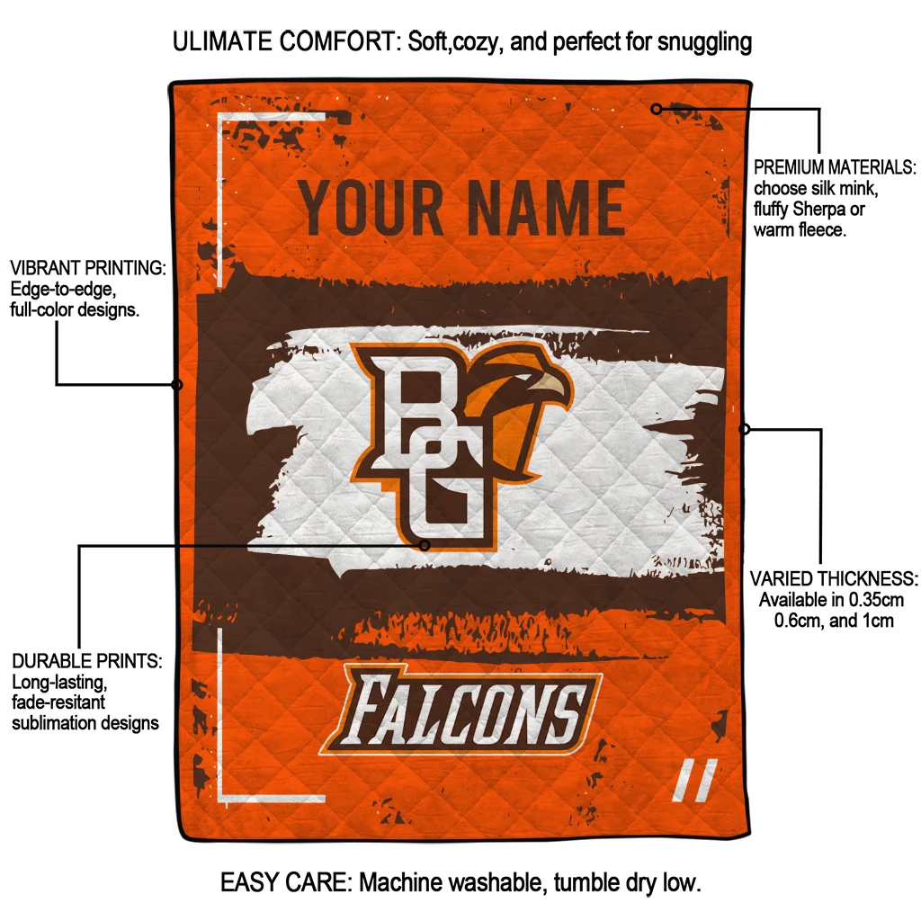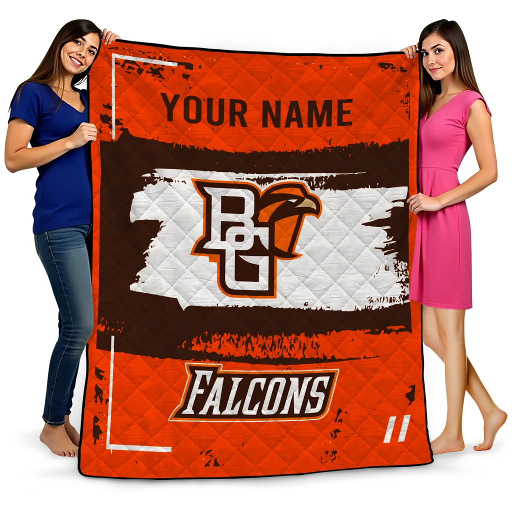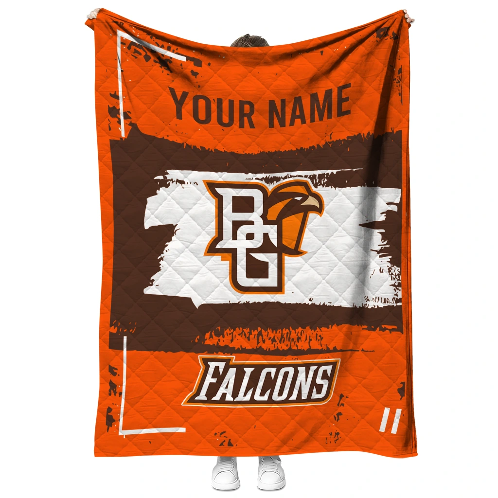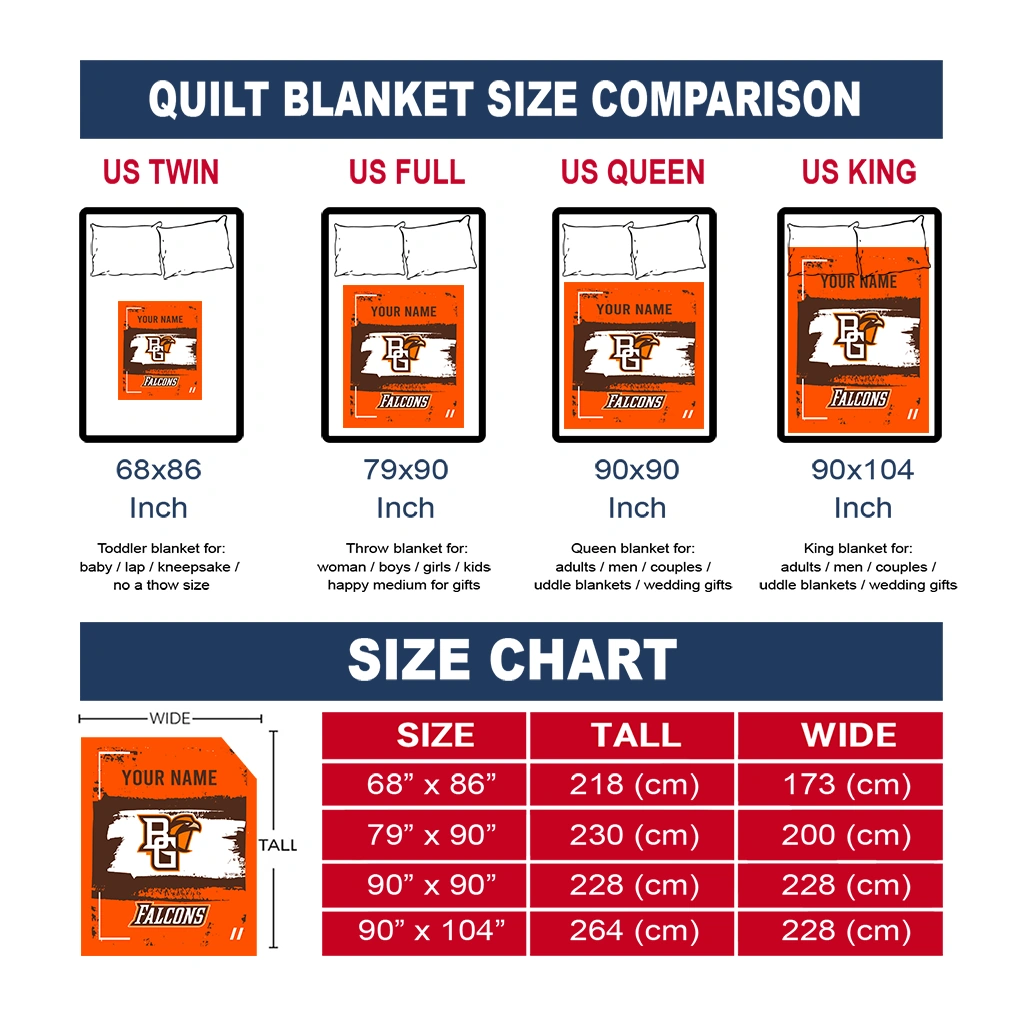 Wrap yourself in warmth and pride with the Customized Bowling Green Falcons Grunge Patch Orange White Quilt Blanket from the Bowling Green Falcons Blankets collection at Yes That Blanket. Made from 100% premium quilting-weight polyester blended with a touch of microfiber, this quilt offers a smooth, soft finish you’ll love. Choose between two quilting styles—Stipple or Diagonal—and enjoy the comfort of a cotton-filled layer inside that adds extra coziness for every season. The border is available in classic black or white, giving your design a clean, timeless edge.