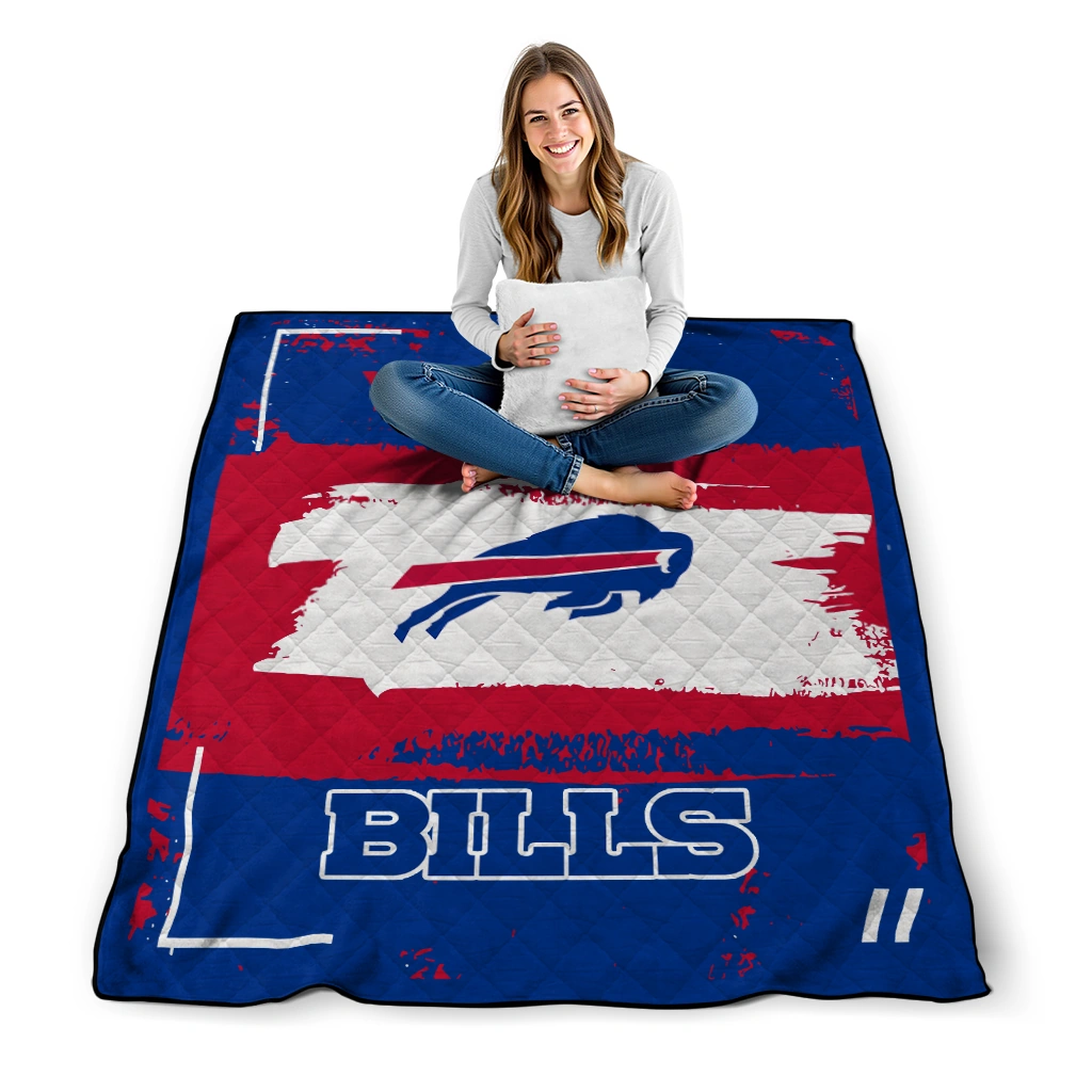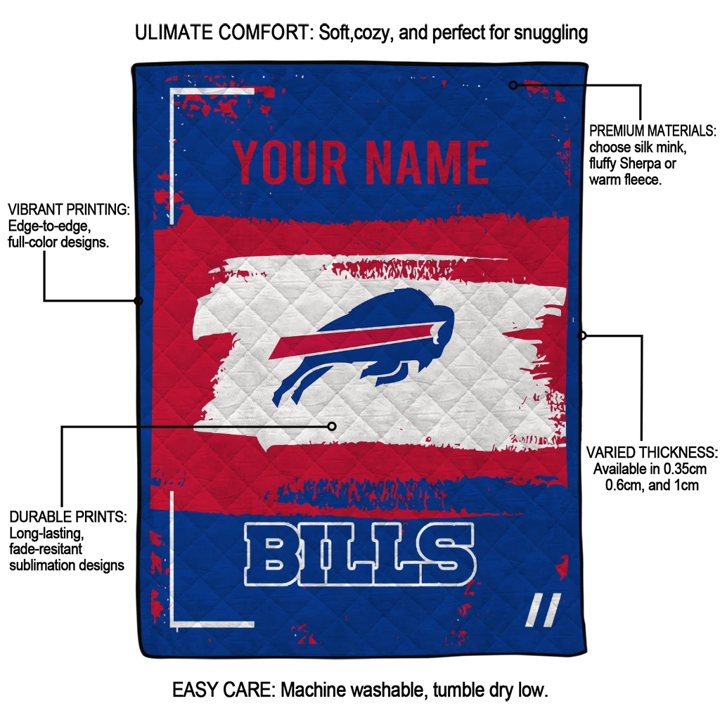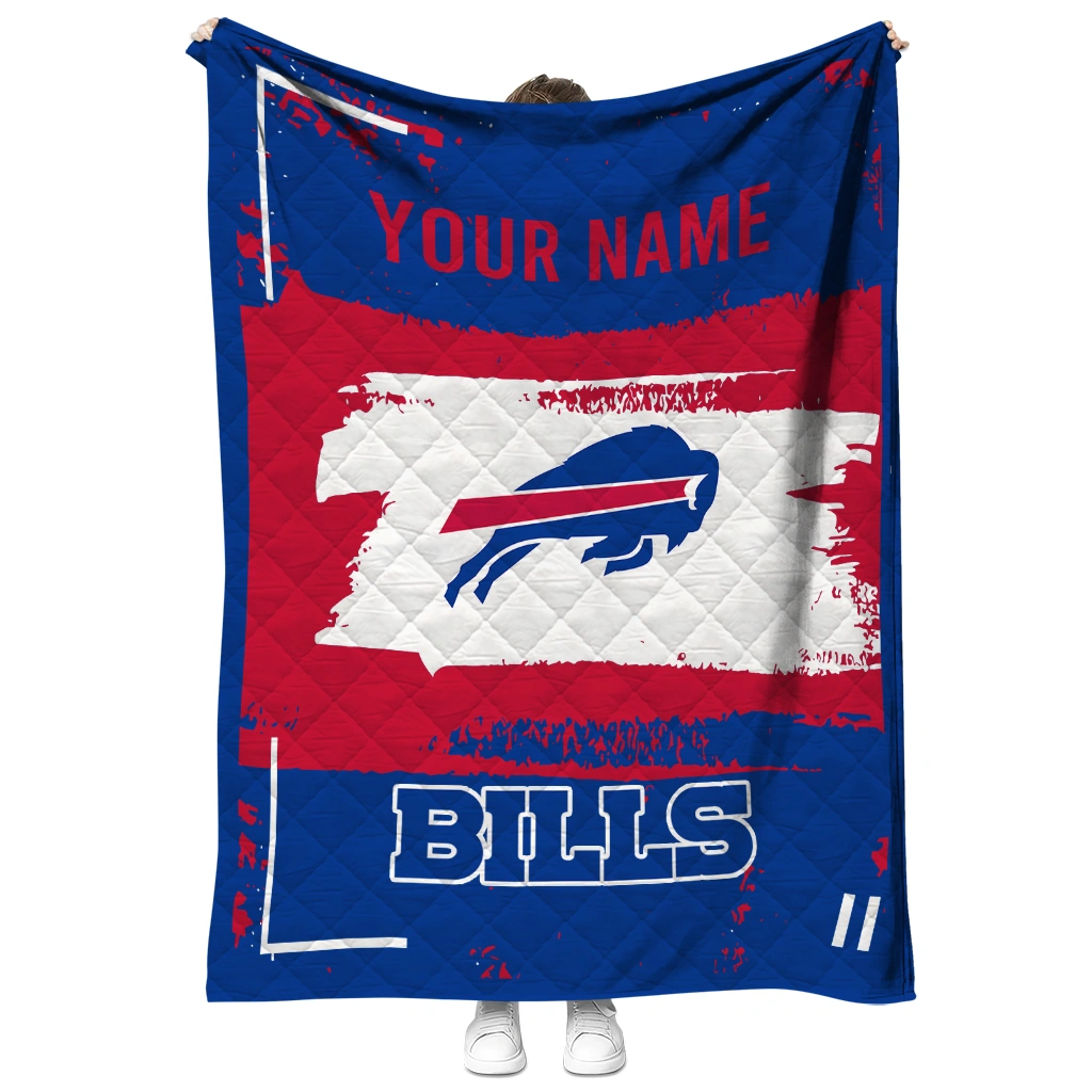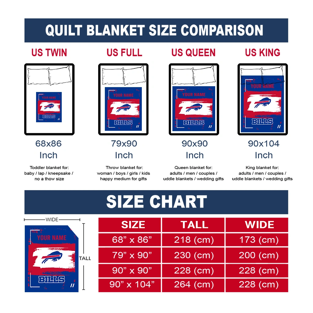 Wrap yourself in warmth and pride with the Customized Buffalo Bills Grunge Patch Blue White Quilt Blanket from the Buffalo Bills Blankets collection at Yes That Blanket. Made from 100% premium quilting-weight polyester blended with a touch of microfiber, this quilt offers a smooth, soft finish you’ll love. Choose between two quilting styles—Stipple or Diagonal—and enjoy the comfort of a cotton-filled layer inside that adds extra coziness for every season. The border is available in classic black or white, giving your design a clean, timeless edge.
