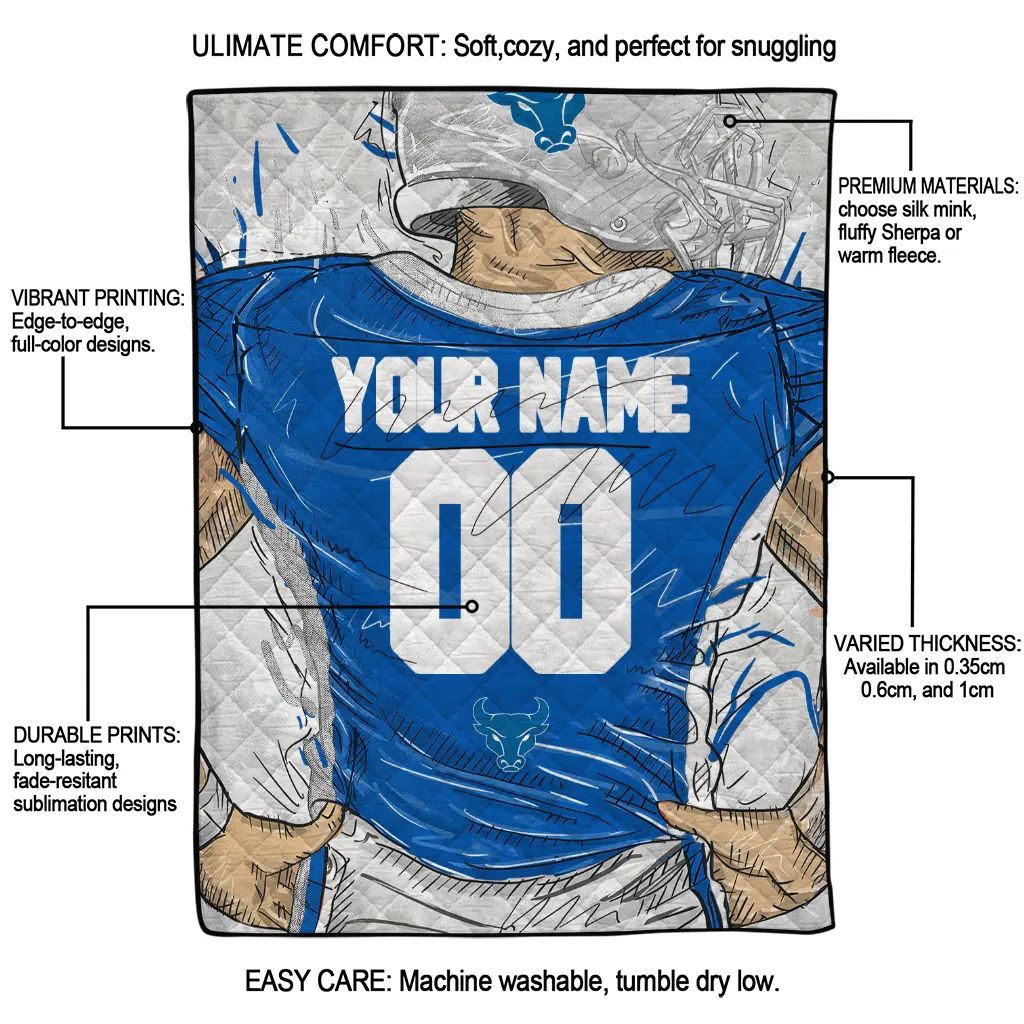 Wrap yourself in warmth and pride with the Customized Buffalo Bulls Player Sketch Royal Blue Gray Quilt Blanket from the Buffalo Bulls Blankets collection at Yes That Blanket. Made from 100% premium quilting-weight polyester blended with a touch of microfiber, this quilt offers a smooth, soft finish you’ll love. Choose between two quilting styles—Stipple or Diagonal—and enjoy the comfort of a cotton-filled layer inside that adds extra coziness for every season. The border is available in classic black or white, giving your design a clean, timeless edge.