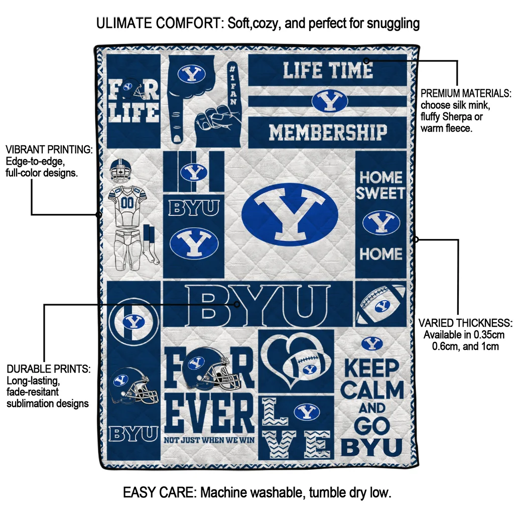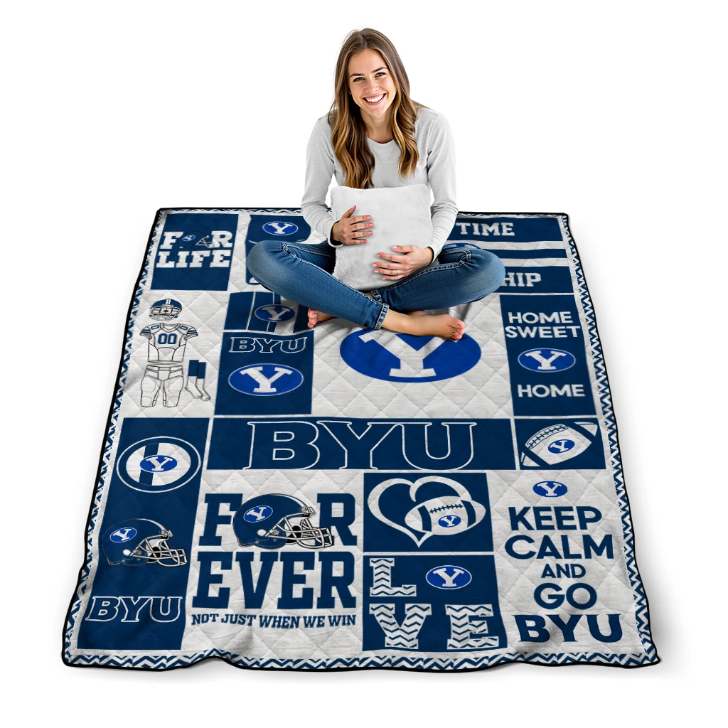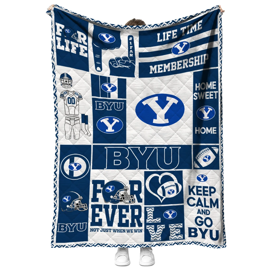 Wrap yourself in warmth and pride with the Customized BYU Cougars Helmet Passion Blue Quilt Blanket from the BYU Cougars Blankets collection at Yes That Blanket. Made from 100% premium quilting-weight polyester blended with a touch of microfiber, this quilt offers a smooth, soft finish you’ll love. Choose between two quilting styles—Stipple or Diagonal—and enjoy the comfort of a cotton-filled layer inside that adds extra coziness for every season. The border is available in classic black or white, giving your design a clean, timeless edge.
