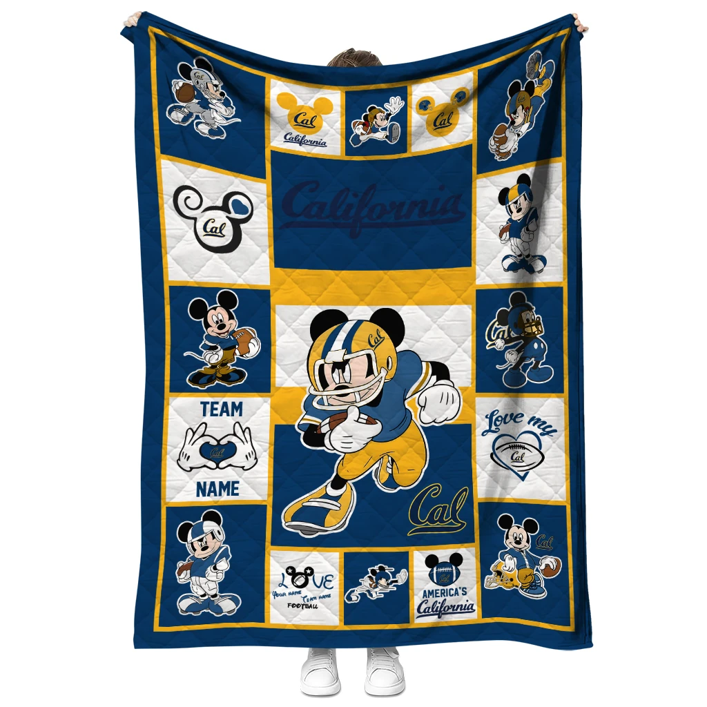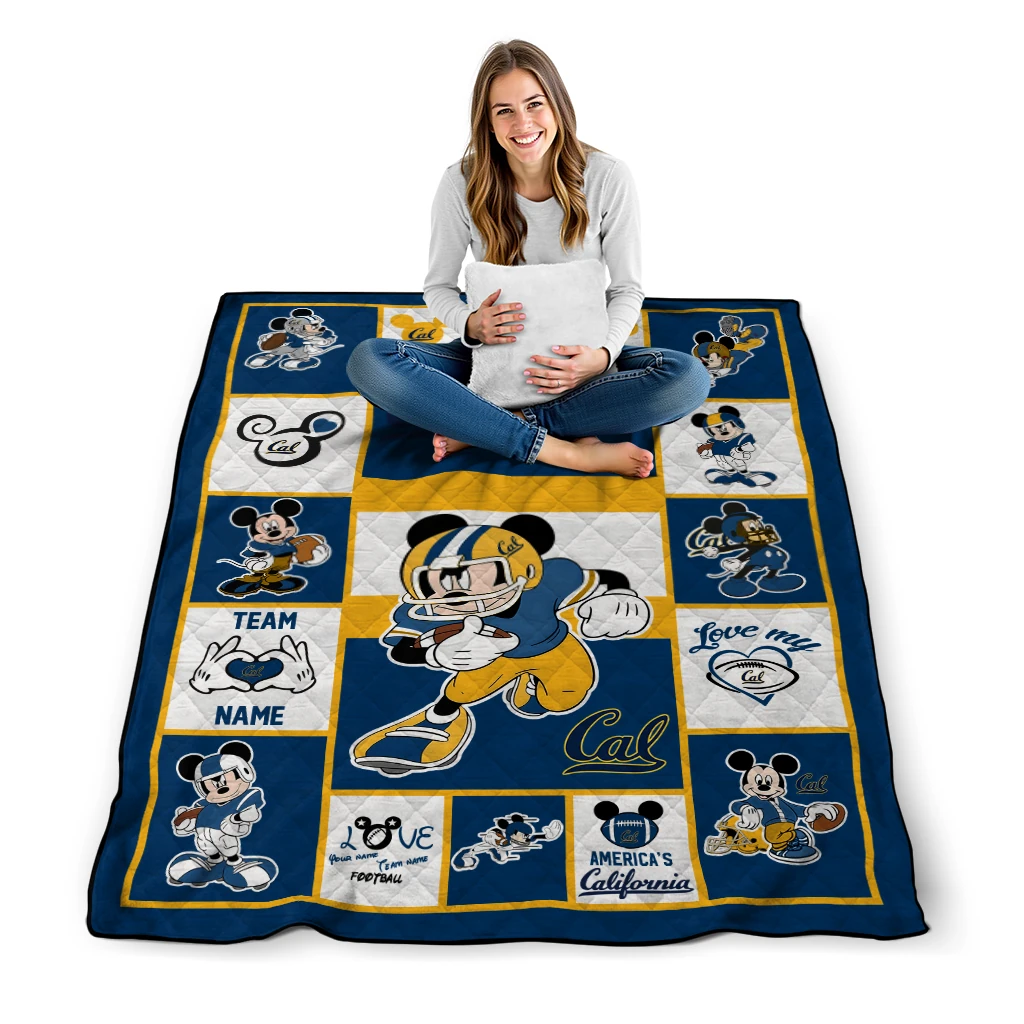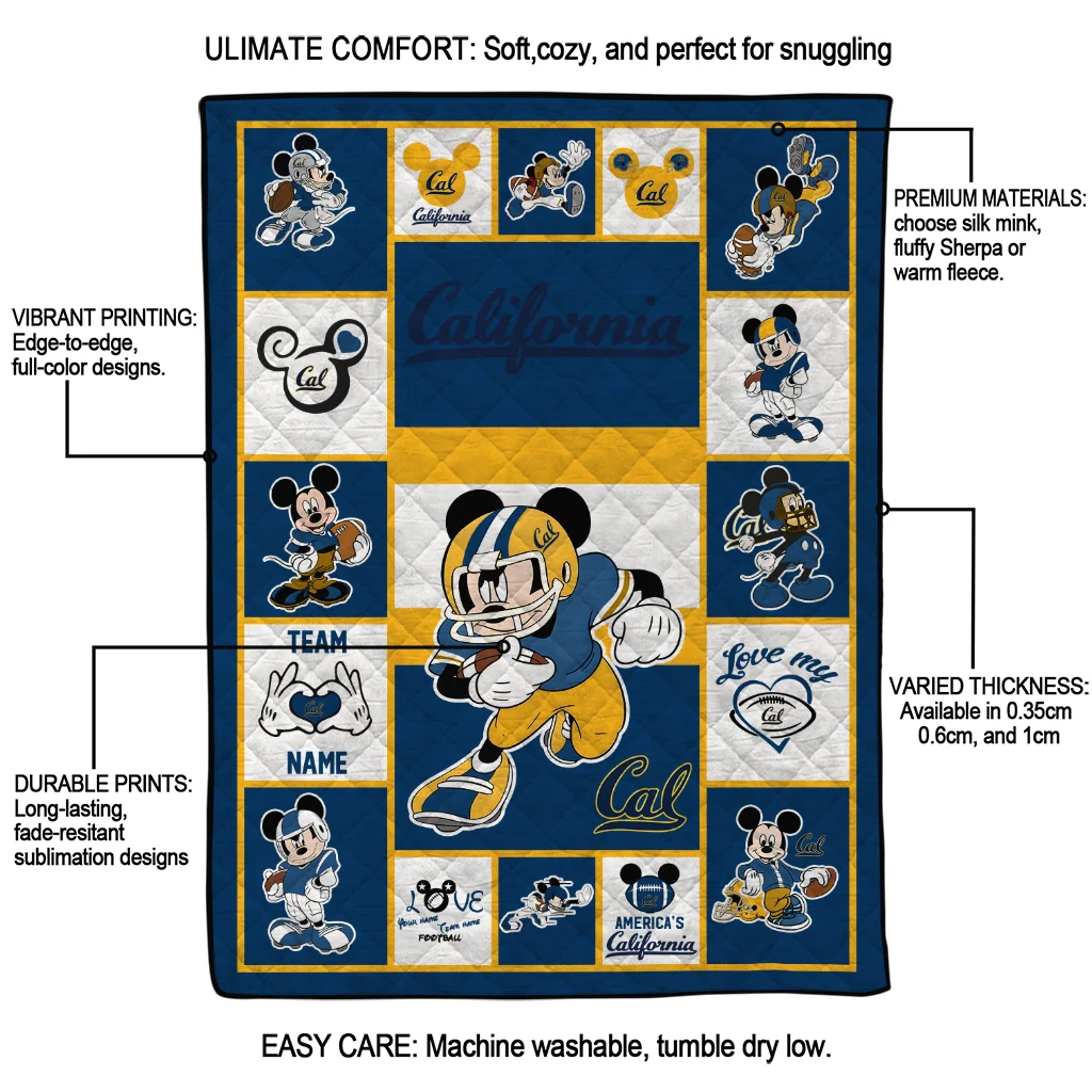Wrap yourself in warmth and pride with the Customized California Golden Bears Mickey Crimson Blue White Quilt Blanket from the California Golden Bears Blankets collection at Yes That Blanket. Made from 100% premium quilting-weight polyester blended with a touch of microfiber, this quilt offers a smooth, soft finish you’ll love. Choose between two quilting styles—Stipple or Diagonal—and enjoy the comfort of a cotton-filled layer inside that adds extra coziness for every season. The border is available in classic black or white, giving your design a clean, timeless edge.
