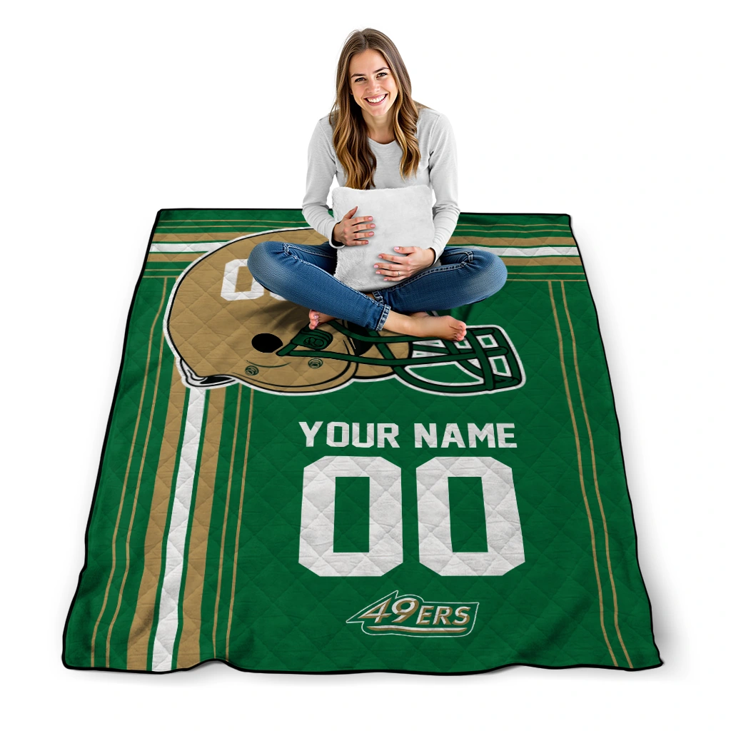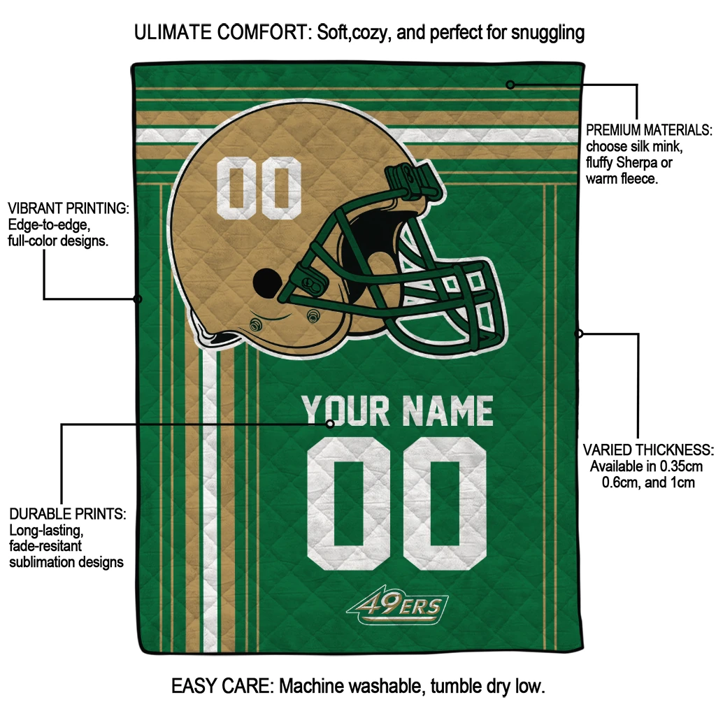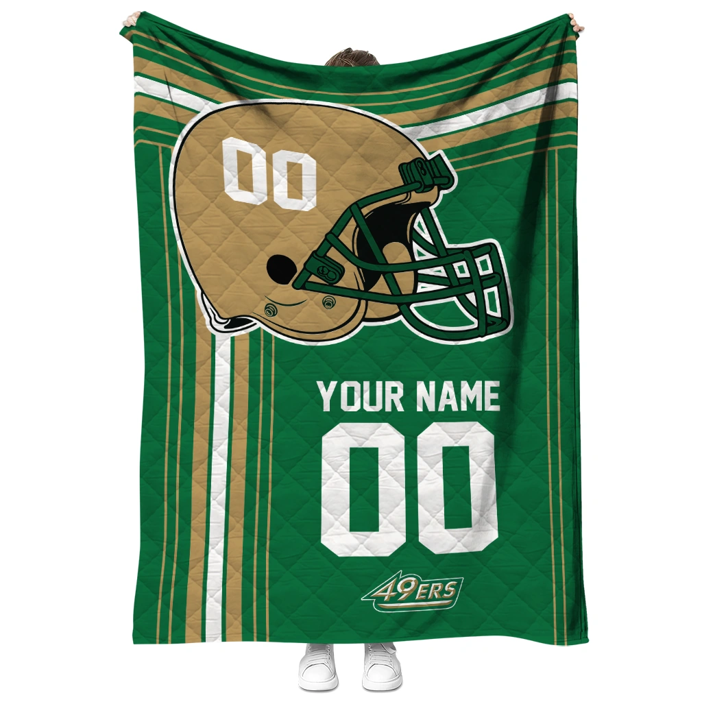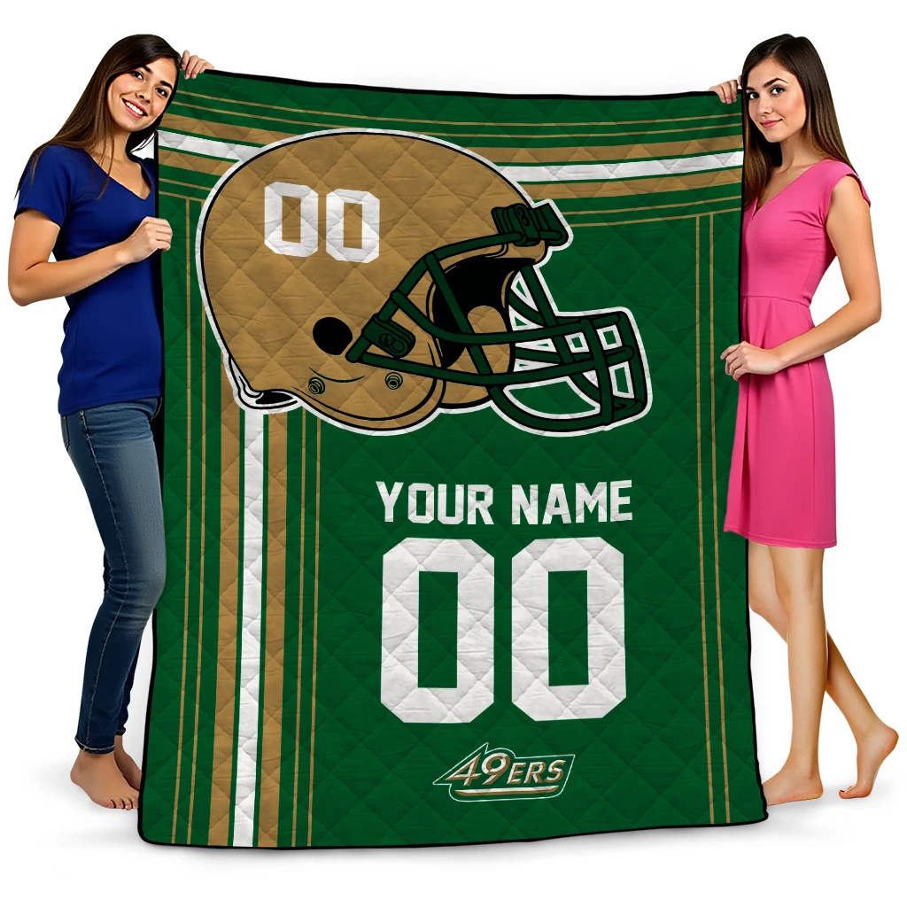 Wrap yourself in warmth and pride with the Customized Charlotte 49ers Helmet Theme Green Quilt Blanket from the Charlotte 49ers Blankets collection at Yes That Blanket. Made from 100% premium quilting-weight polyester blended with a touch of microfiber, this quilt offers a smooth, soft finish you’ll love. Choose between two quilting styles—Stipple or Diagonal—and enjoy the comfort of a cotton-filled layer inside that adds extra coziness for every season. The border is available in classic black or white, giving your design a clean, timeless edge.