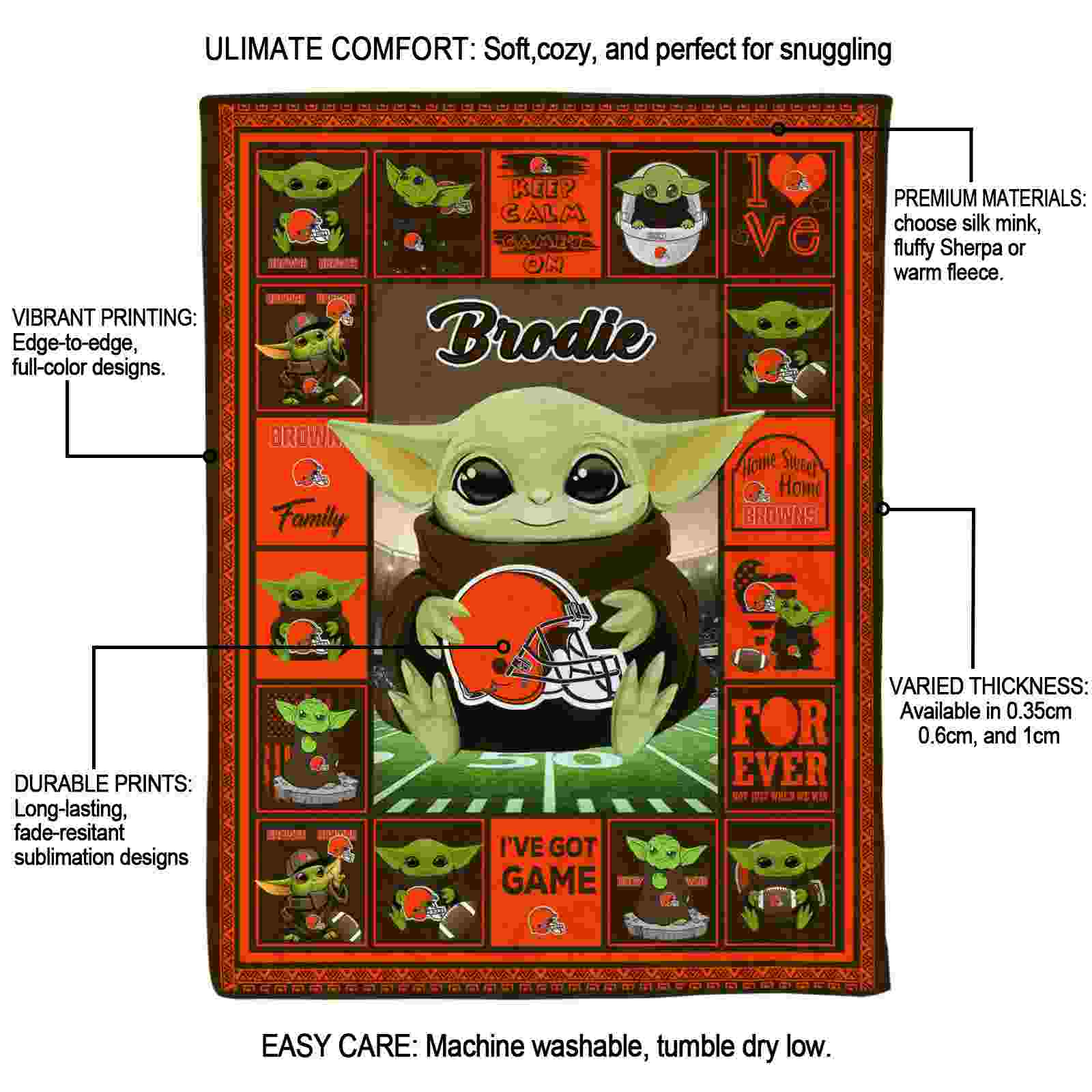 Without a doubt, the Customized Cleveland Browns Baby Yoda Brown Blanket from Cleveland Browns Blankets collection is offering true fans a chance to showcase passion in a cool way. Personalize it with your favorite team’s logo or a meaningful name to make it uniquely yours. Isn’t that great? The full-color print ensures vibrant, edge-to-edge designs, bringing your sports enthusiasm to life!