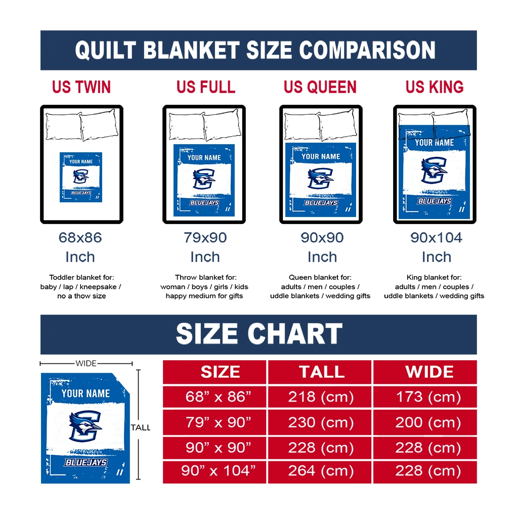 Wrap yourself in warmth and pride with the Customized Creighton Bluejays Grunge Patch Blue White Quilt Blanket from the Creighton Bluejays Blankets collection at Yes That Blanket. Made from 100% premium quilting-weight polyester blended with a touch of microfiber, this quilt offers a smooth, soft finish you’ll love. Choose between two quilting styles—Stipple or Diagonal—and enjoy the comfort of a cotton-filled layer inside that adds extra coziness for every season. The border is available in classic black or white, giving your design a clean, timeless edge.