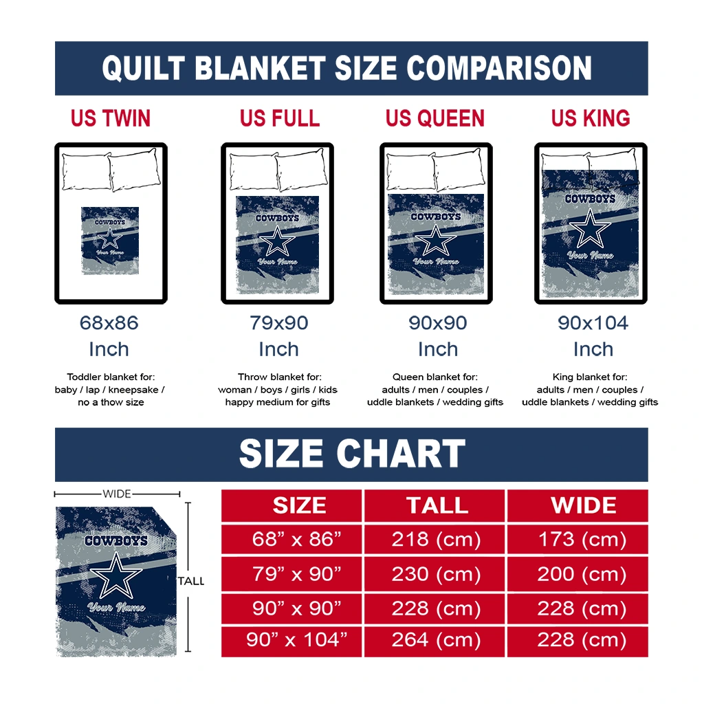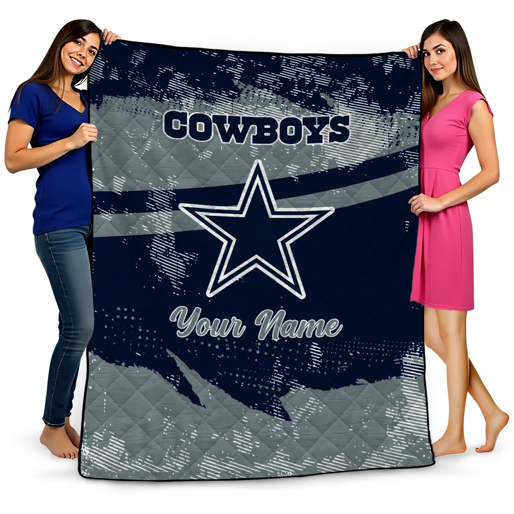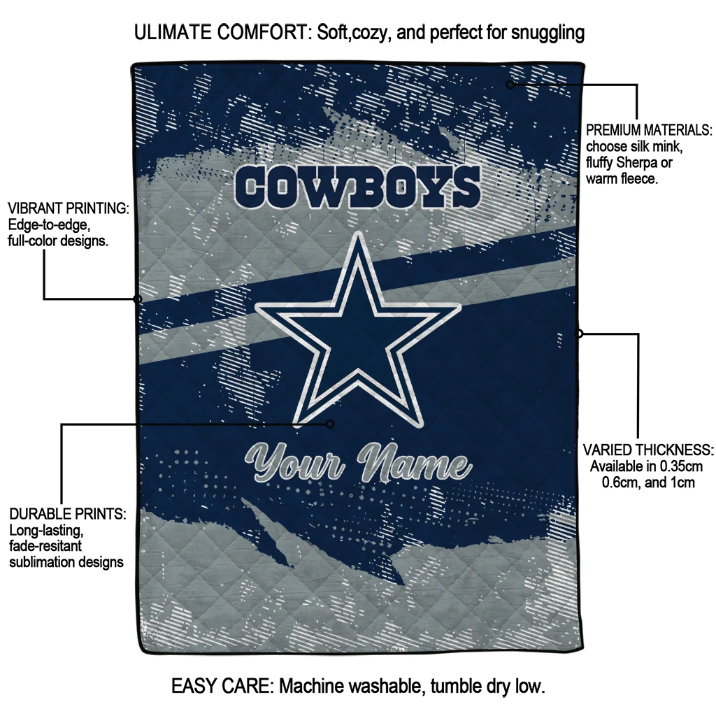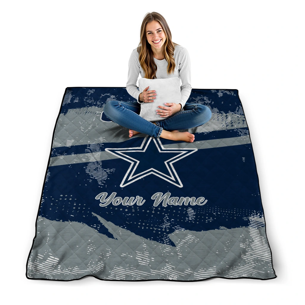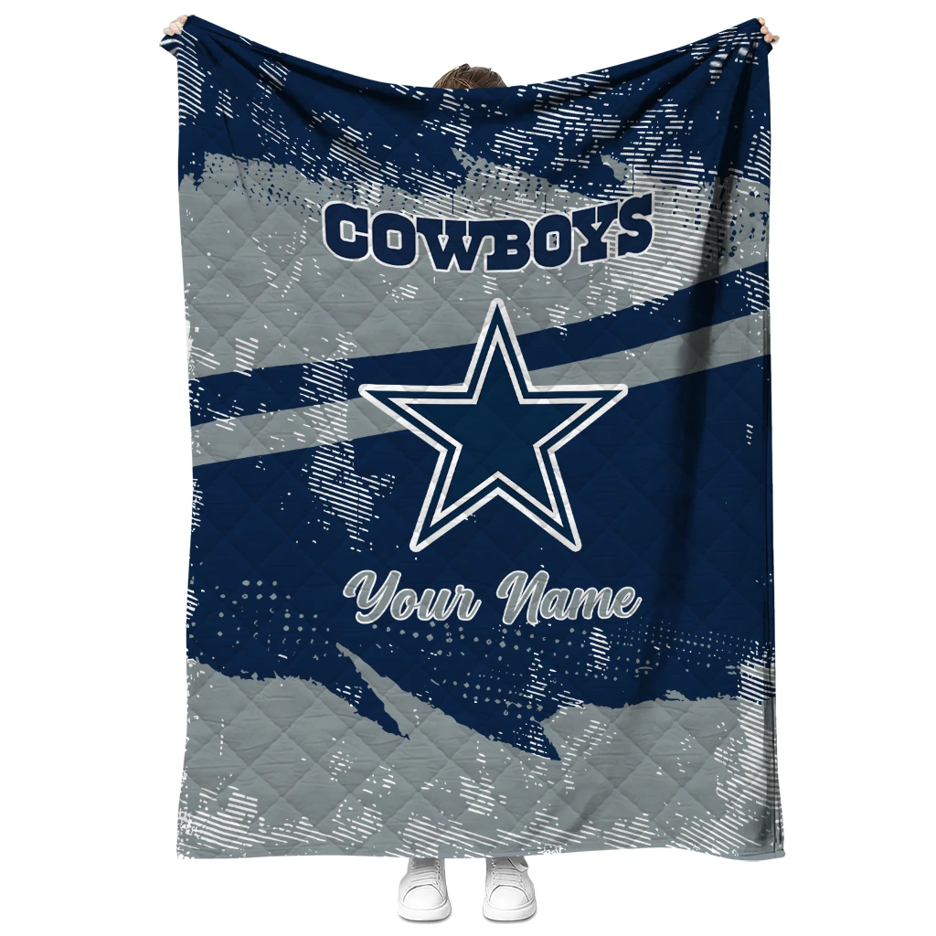 Wrap yourself in warmth and pride with the Customized Dallas Cowboys Brushstroke Layers Blue Quilt Blanket from the Dallas Cowboys Blankets collection at Yes That Blanket. Made from 100% premium quilting-weight polyester blended with a touch of microfiber, this quilt offers a smooth, soft finish you’ll love. Choose between two quilting styles—Stipple or Diagonal—and enjoy the comfort of a cotton-filled layer inside that adds extra coziness for every season. The border is available in classic black or white, giving your design a clean, timeless edge.