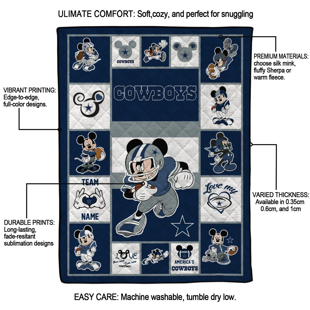 Wrap yourself in warmth and pride with the Customized Dallas Cowboys Mickey Crimson Blue White Quilt Blanket from the Dallas Cowboys Blankets collection at Yes That Blanket. Made from 100% premium quilting-weight polyester blended with a touch of microfiber, this quilt offers a smooth, soft finish you’ll love. Choose between two quilting styles—Stipple or Diagonal—and enjoy the comfort of a cotton-filled layer inside that adds extra coziness for every season. The border is available in classic black or white, giving your design a clean, timeless edge.