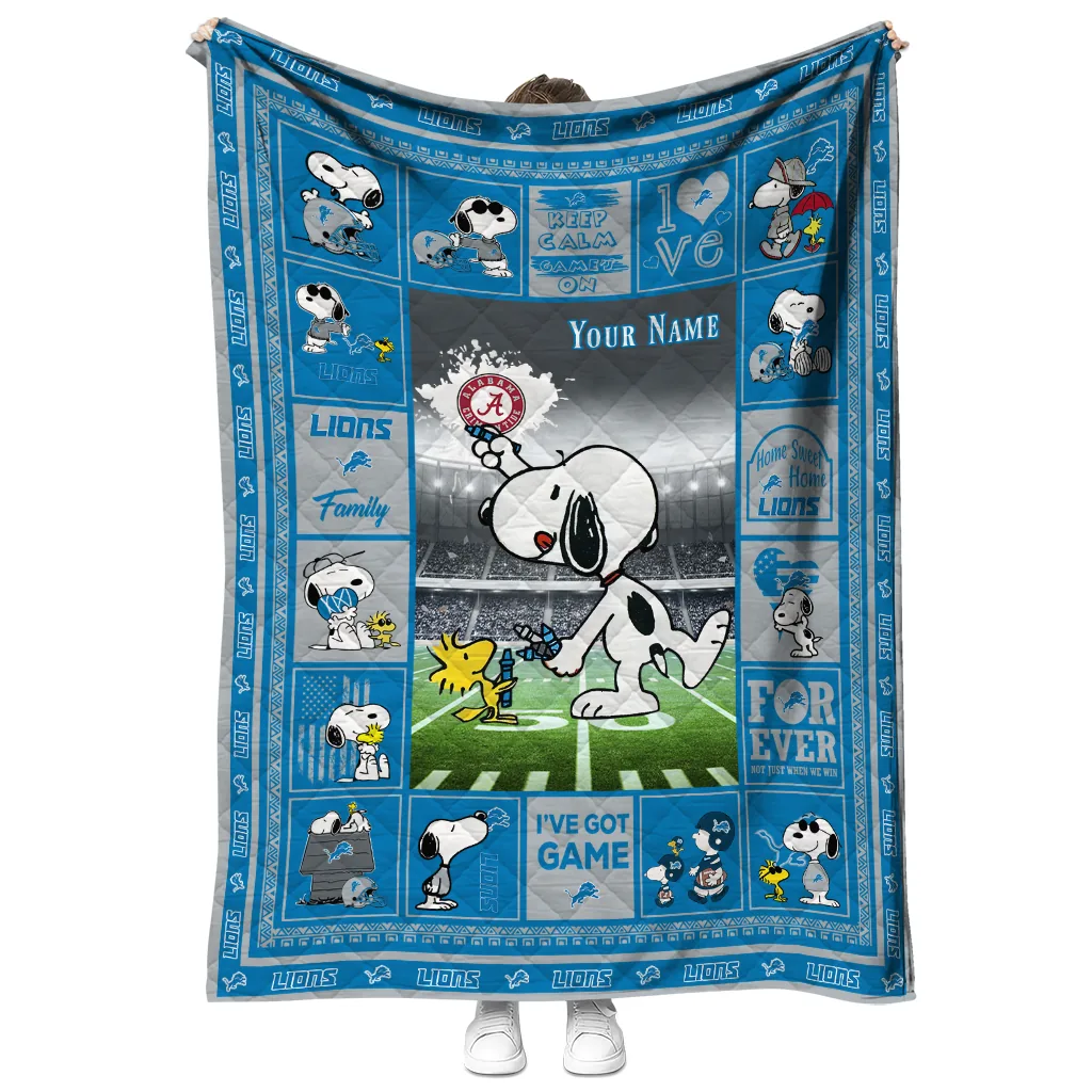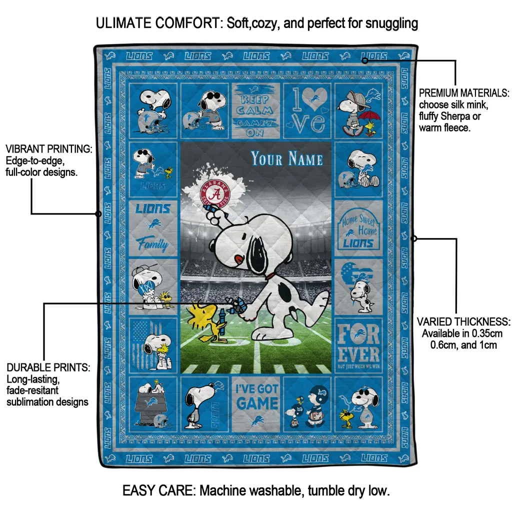 Wrap yourself in warmth and pride with the Customized Detroit Lions Snoopy Coach Blue Quilt Blanket from the Detroit Lions Blankets collection at Yes That Blanket. Made from 100% premium quilting-weight polyester blended with a touch of microfiber, this quilt offers a smooth, soft finish you’ll love. Choose between two quilting styles—Stipple or Diagonal—and enjoy the comfort of a cotton-filled layer inside that adds extra coziness for every season. The border is available in classic black or white, giving your design a clean, timeless edge.