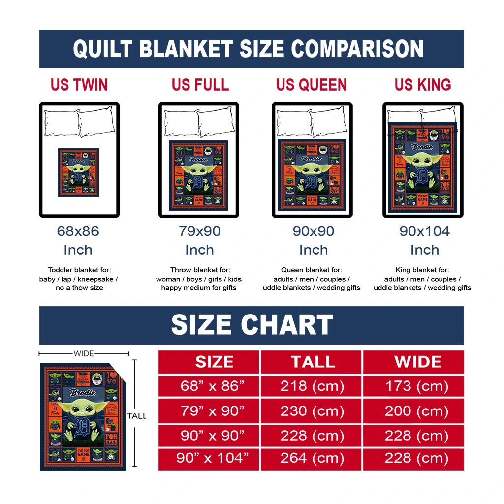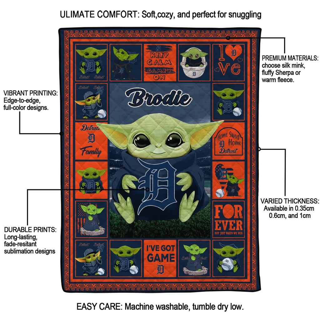 Wrap yourself in warmth and pride with the Customized Detroit Tigers Yody Baby Motif Navy Quilt Blanket from the Detroit Tigers Blankets collection at Yes That Blanket. Made from 100% premium quilting-weight polyester blended with a touch of microfiber, this quilt offers a smooth, soft finish you’ll love. Choose between two quilting styles—Stipple or Diagonal—and enjoy the comfort of a cotton-filled layer inside that adds extra coziness for every season. The border is available in classic black or white, giving your design a clean, timeless edge.