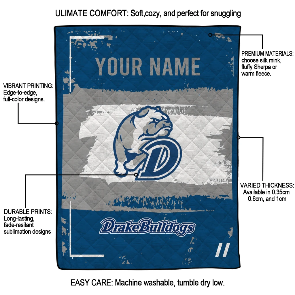 Wrap yourself in warmth and pride with the Customized Drake Bulldogs Grunge Patch Blue White Quilt Blanket from the Drake Bulldogs Blankets collection at Yes That Blanket. Made from 100% premium quilting-weight polyester blended with a touch of microfiber, this quilt offers a smooth, soft finish you’ll love. Choose between two quilting styles—Stipple or Diagonal—and enjoy the comfort of a cotton-filled layer inside that adds extra coziness for every season. The border is available in classic black or white, giving your design a clean, timeless edge.
