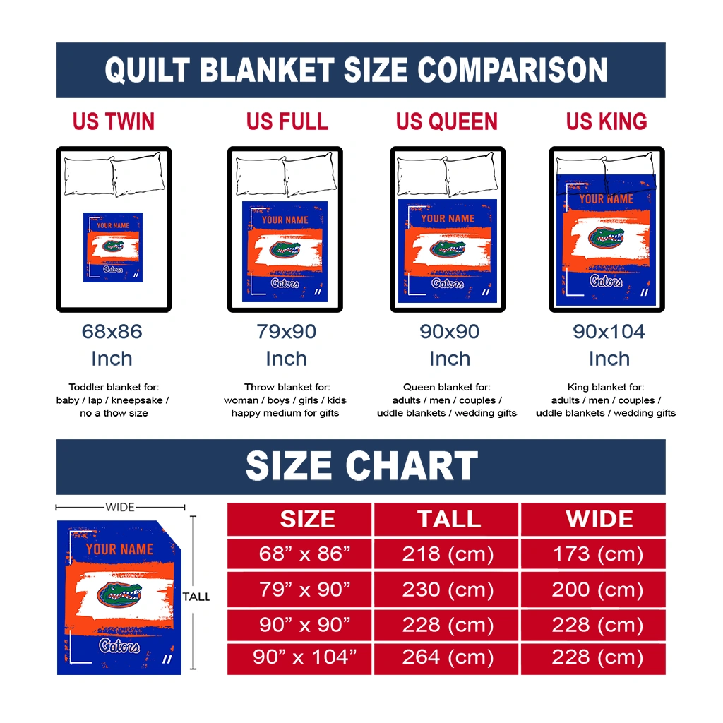 Wrap yourself in warmth and pride with the Customized Florida Gators Grunge Patch Blue White Quilt Blanket from the Florida Gators Blankets collection at Yes That Blanket. Made from 100% premium quilting-weight polyester blended with a touch of microfiber, this quilt offers a smooth, soft finish you’ll love. Choose between two quilting styles—Stipple or Diagonal—and enjoy the comfort of a cotton-filled layer inside that adds extra coziness for every season. The border is available in classic black or white, giving your design a clean, timeless edge.