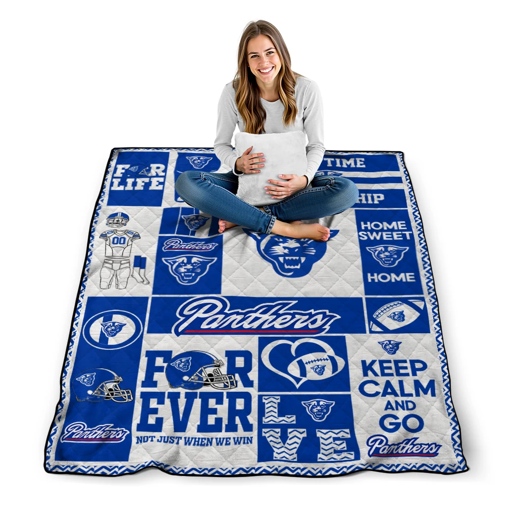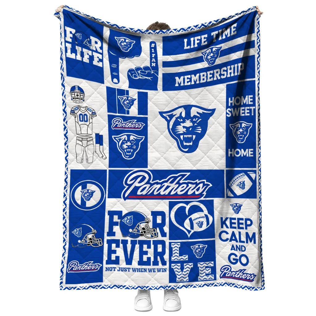 Wrap yourself in warmth and pride with the Customized Georgia State Panthers Helmet Passion Blue Quilt Blanket from the Georgia State Panthers Blankets collection at Yes That Blanket. Made from 100% premium quilting-weight polyester blended with a touch of microfiber, this quilt offers a smooth, soft finish you’ll love. Choose between two quilting styles—Stipple or Diagonal—and enjoy the comfort of a cotton-filled layer inside that adds extra coziness for every season. The border is available in classic black or white, giving your design a clean, timeless edge.