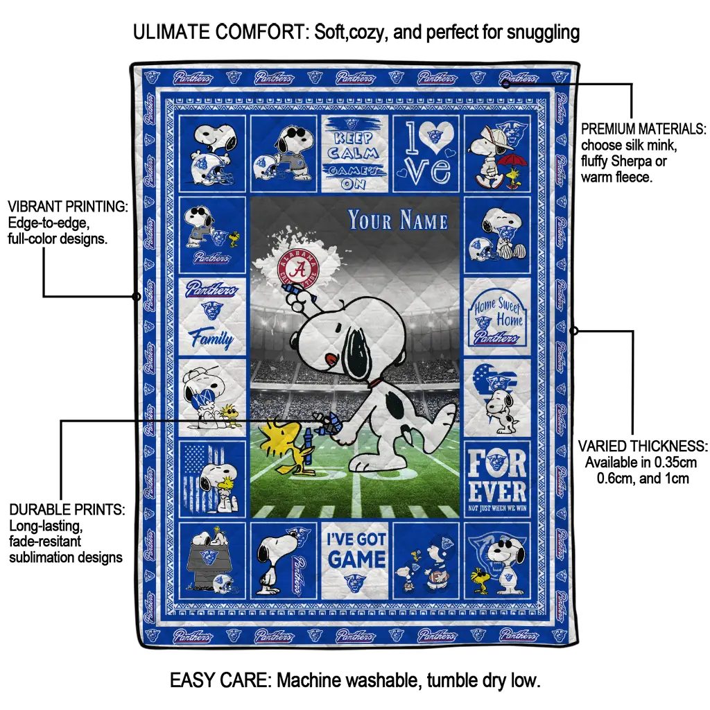 Wrap yourself in warmth and pride with the Customized Georgia State Panthers Snoopy Coach Blue Quilt Blanket from the Georgia State Panthers Blankets collection at Yes That Blanket. Made from 100% premium quilting-weight polyester blended with a touch of microfiber, this quilt offers a smooth, soft finish you’ll love. Choose between two quilting styles—Stipple or Diagonal—and enjoy the comfort of a cotton-filled layer inside that adds extra coziness for every season. The border is available in classic black or white, giving your design a clean, timeless edge.