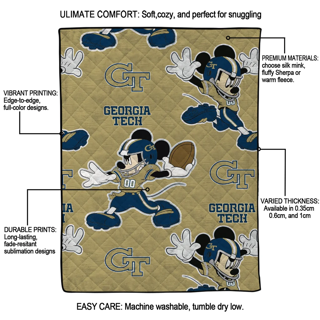 The Customized Georgia Tech Yellow Jackets Mickey Football Gold Quilt Blanket is more than a blanket—it’s everyday comfort, thoughtfully made. Crafted from premium quilting fabric with a soft microfiber touch, it offers a smooth hand-feel and lasting coziness. Layered quilting with a cotton-filled core provides adaptable warmth across seasons while maintaining a clean, tailored look on your bed or sofa.