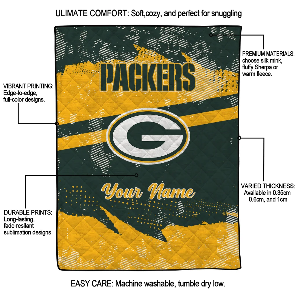 Wrap yourself in warmth and pride with the Customized Green Bay Packers Brushstroke Layers Green Quilt Blanket from the Green Bay Packers Blankets collection at Yes That Blanket. Made from 100% premium quilting-weight polyester blended with a touch of microfiber, this quilt offers a smooth, soft finish you’ll love. Choose between two quilting styles—Stipple or Diagonal—and enjoy the comfort of a cotton-filled layer inside that adds extra coziness for every season. The border is available in classic black or white, giving your design a clean, timeless edge.