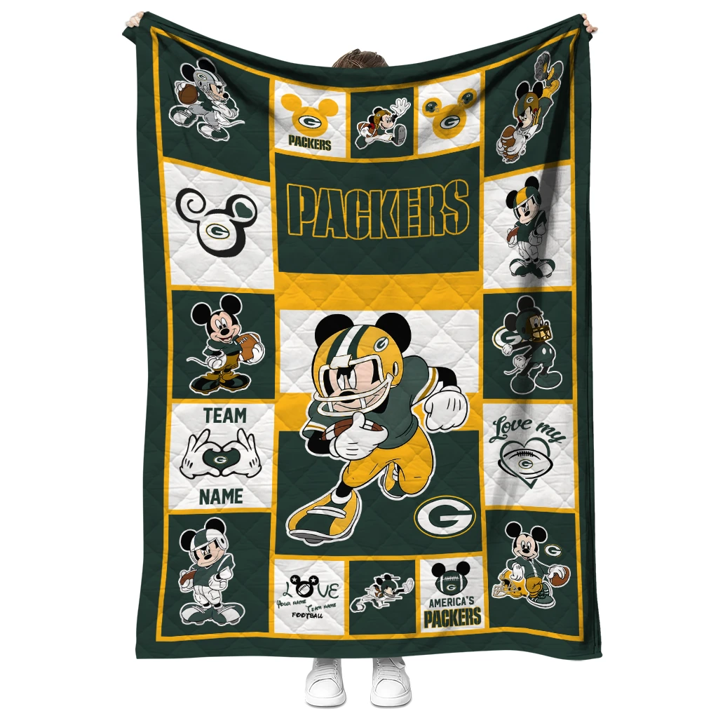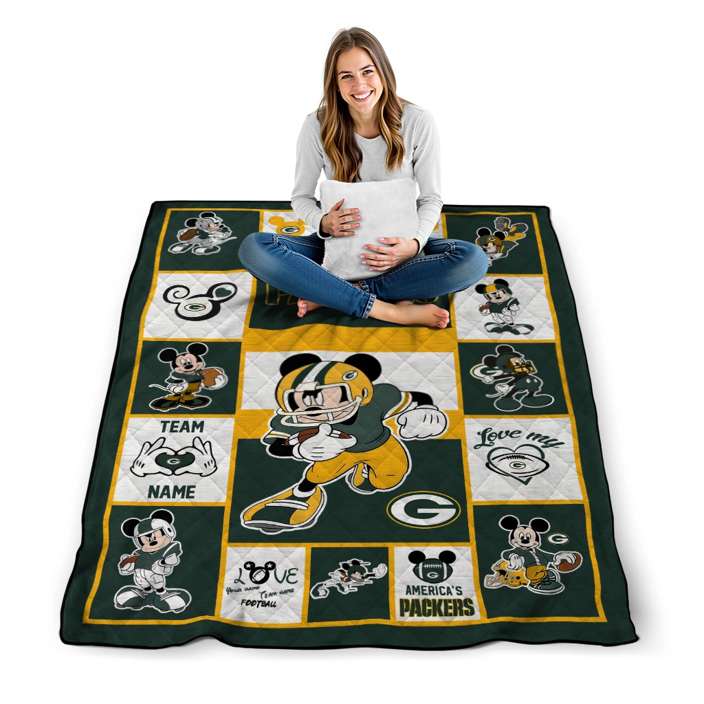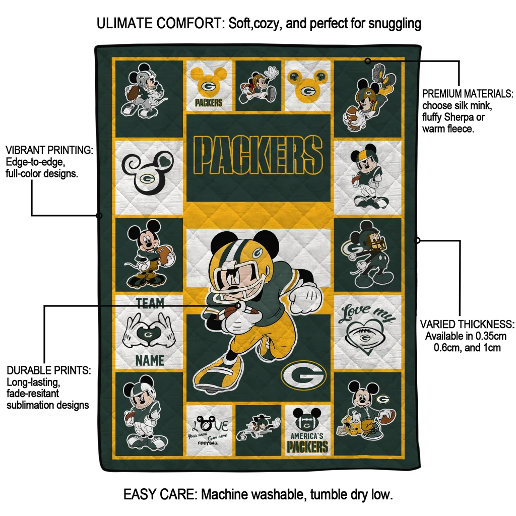 Wrap yourself in warmth and pride with the Customized Green Bay Packers Mickey Crimson Green White Quilt Blanket from the Green Bay Packers Blankets collection at Yes That Blanket. Made from 100% premium quilting-weight polyester blended with a touch of microfiber, this quilt offers a smooth, soft finish you’ll love. Choose between two quilting styles—Stipple or Diagonal—and enjoy the comfort of a cotton-filled layer inside that adds extra coziness for every season. The border is available in classic black or white, giving your design a clean, timeless edge.