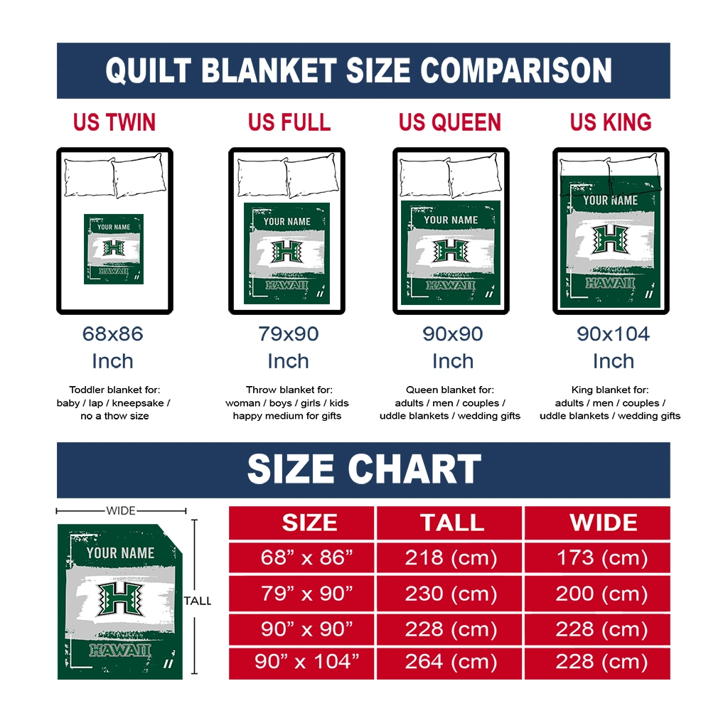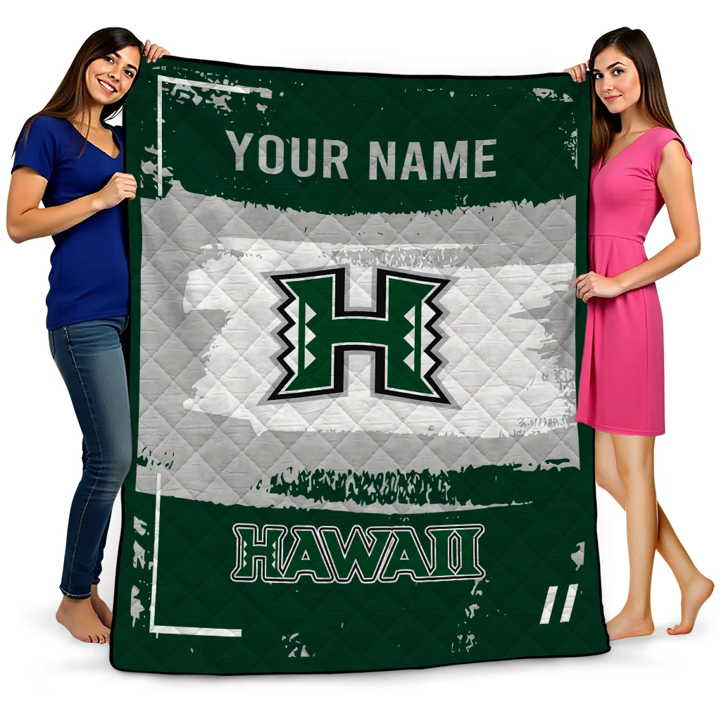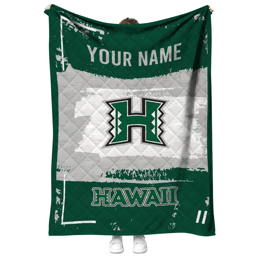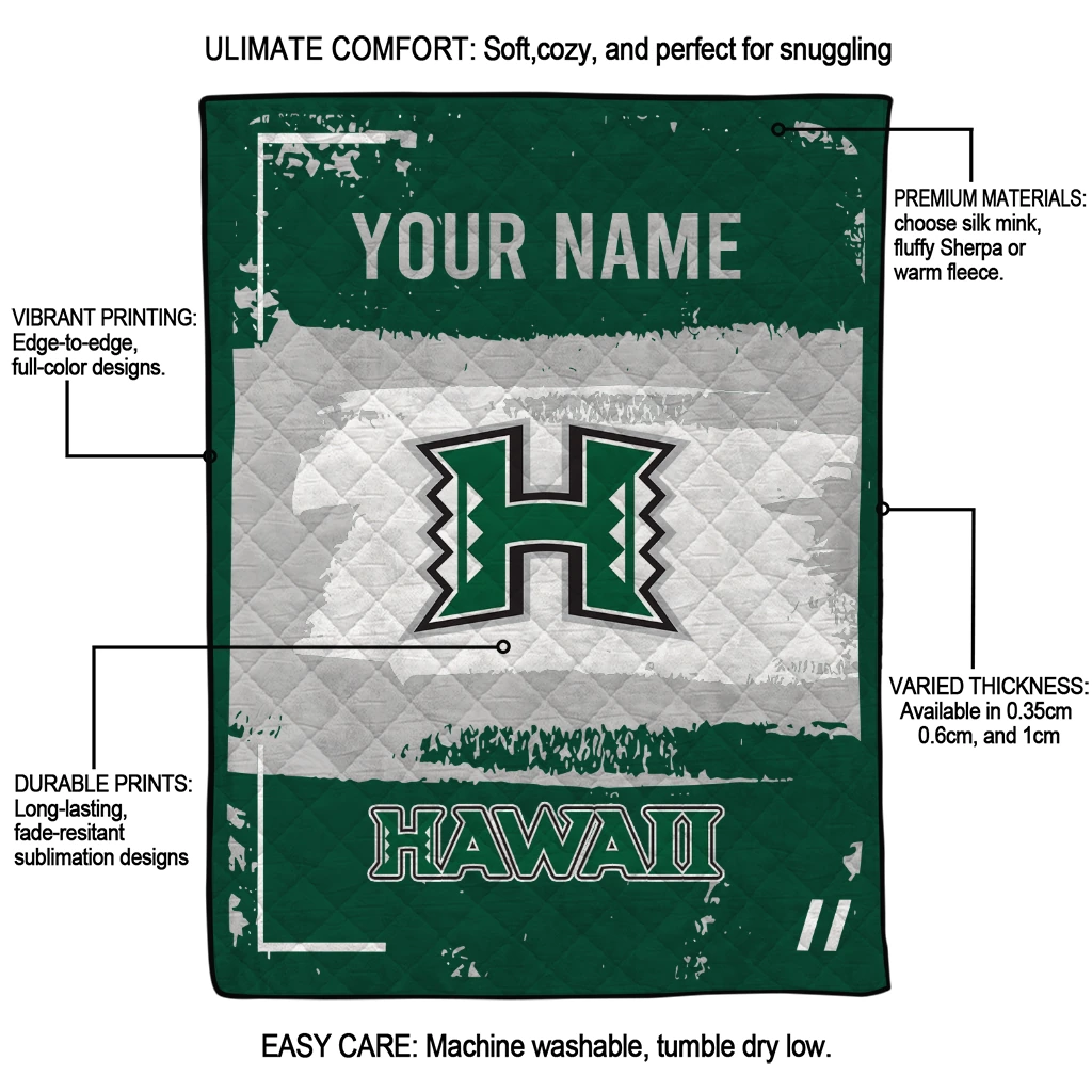 Wrap yourself in warmth and pride with the Customized Hawaii Rainbow Warriors Grunge Patch Green White Quilt Blanket from the Hawaii Rainbow Warriors Blankets collection at Yes That Blanket. Made from 100% premium quilting-weight polyester blended with a touch of microfiber, this quilt offers a smooth, soft finish you’ll love. Choose between two quilting styles—Stipple or Diagonal—and enjoy the comfort of a cotton-filled layer inside that adds extra coziness for every season. The border is available in classic black or white, giving your design a clean, timeless edge.