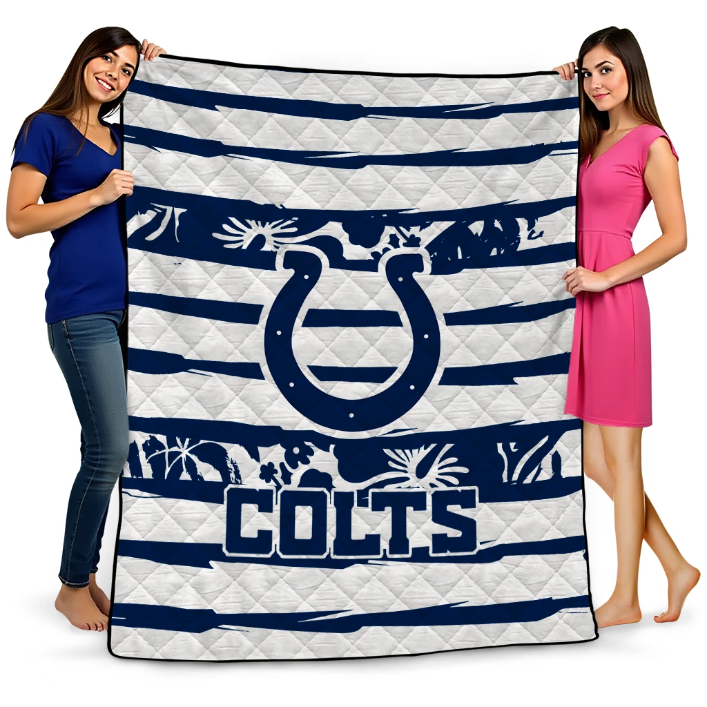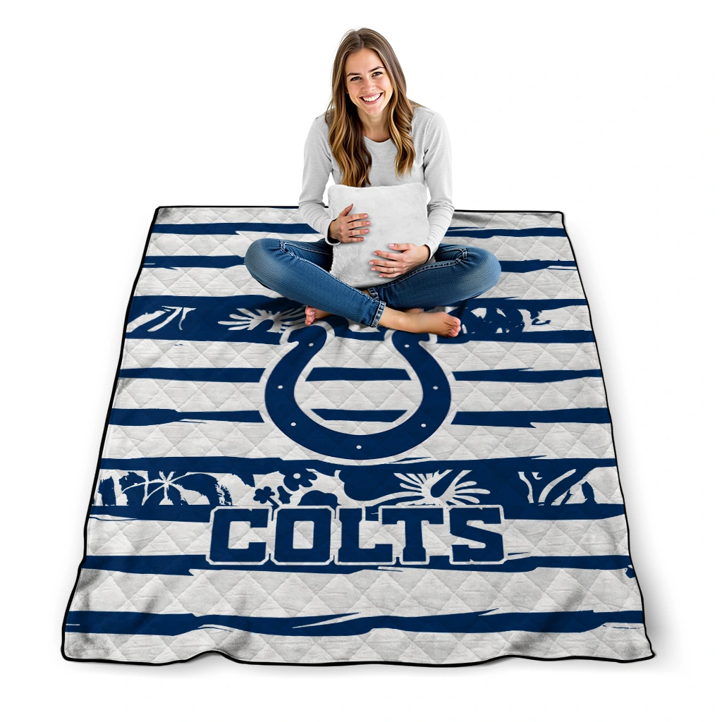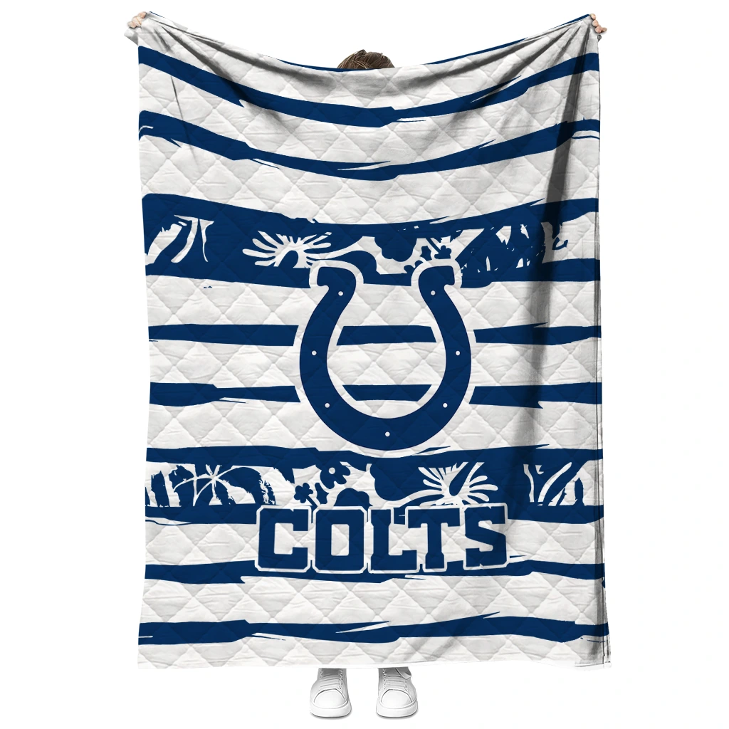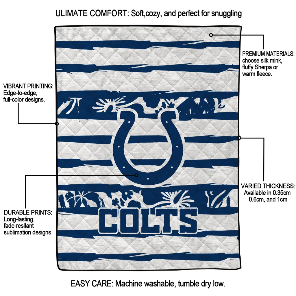 Wrap yourself in warmth and pride with the Customized Indianapolis Colts Layered Florals Blue White Quilt Blanket from the Indianapolis Colts Blankets collection at Yes That Blanket. Made from 100% premium quilting-weight polyester blended with a touch of microfiber, this quilt offers a smooth, soft finish you’ll love. Choose between two quilting styles—Stipple or Diagonal—and enjoy the comfort of a cotton-filled layer inside that adds extra coziness for every season. The border is available in classic black or white, giving your design a clean, timeless edge.