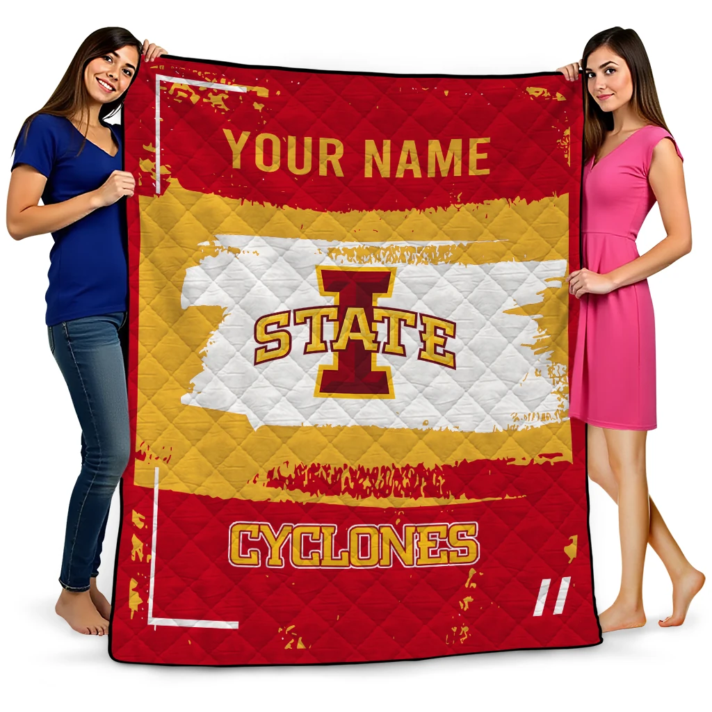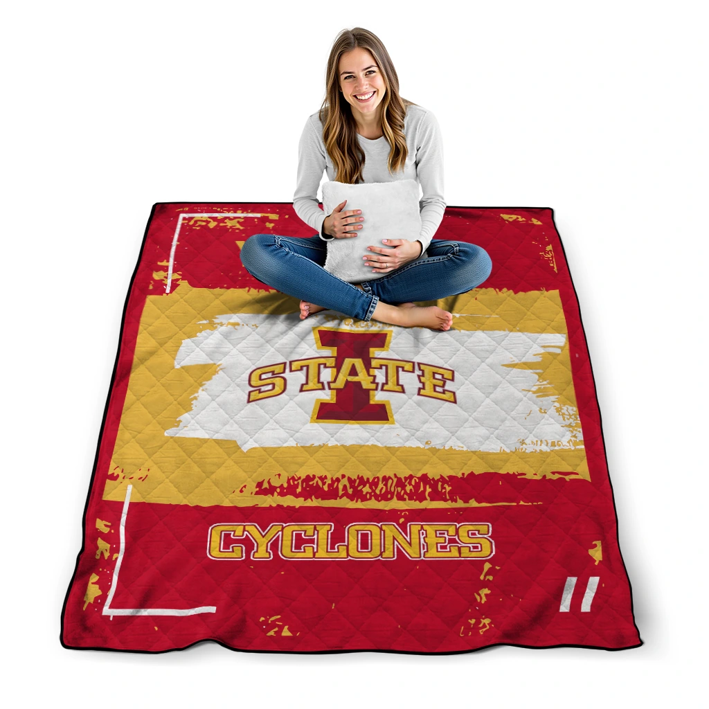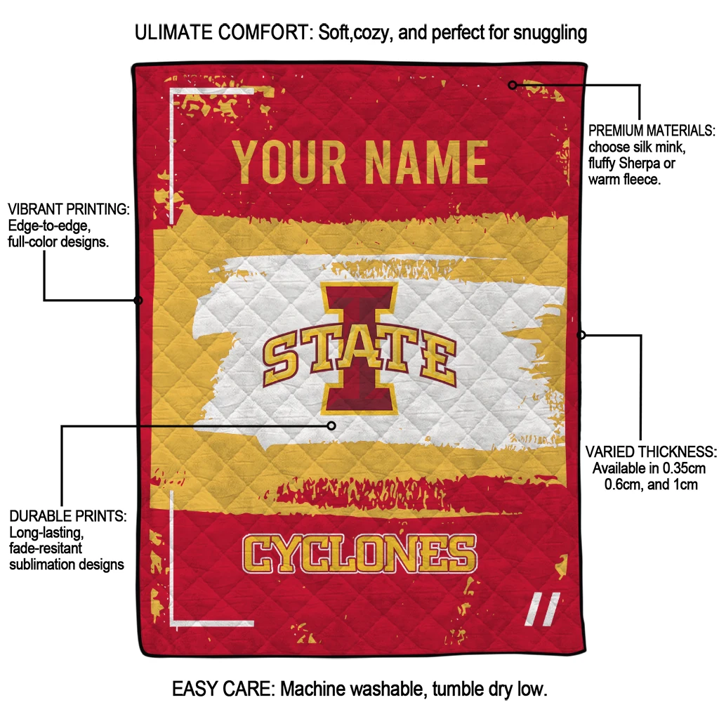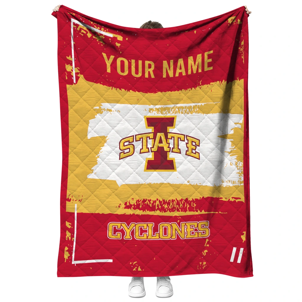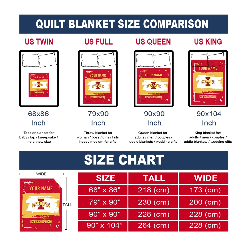 Wrap yourself in warmth and pride with the Customized Iowa State Cyclones Grunge Patch Red White Quilt Blanket from the Iowa State Cyclones Blankets collection at Yes That Blanket. Made from 100% premium quilting-weight polyester blended with a touch of microfiber, this quilt offers a smooth, soft finish you’ll love. Choose between two quilting styles—Stipple or Diagonal—and enjoy the comfort of a cotton-filled layer inside that adds extra coziness for every season. The border is available in classic black or white, giving your design a clean, timeless edge.