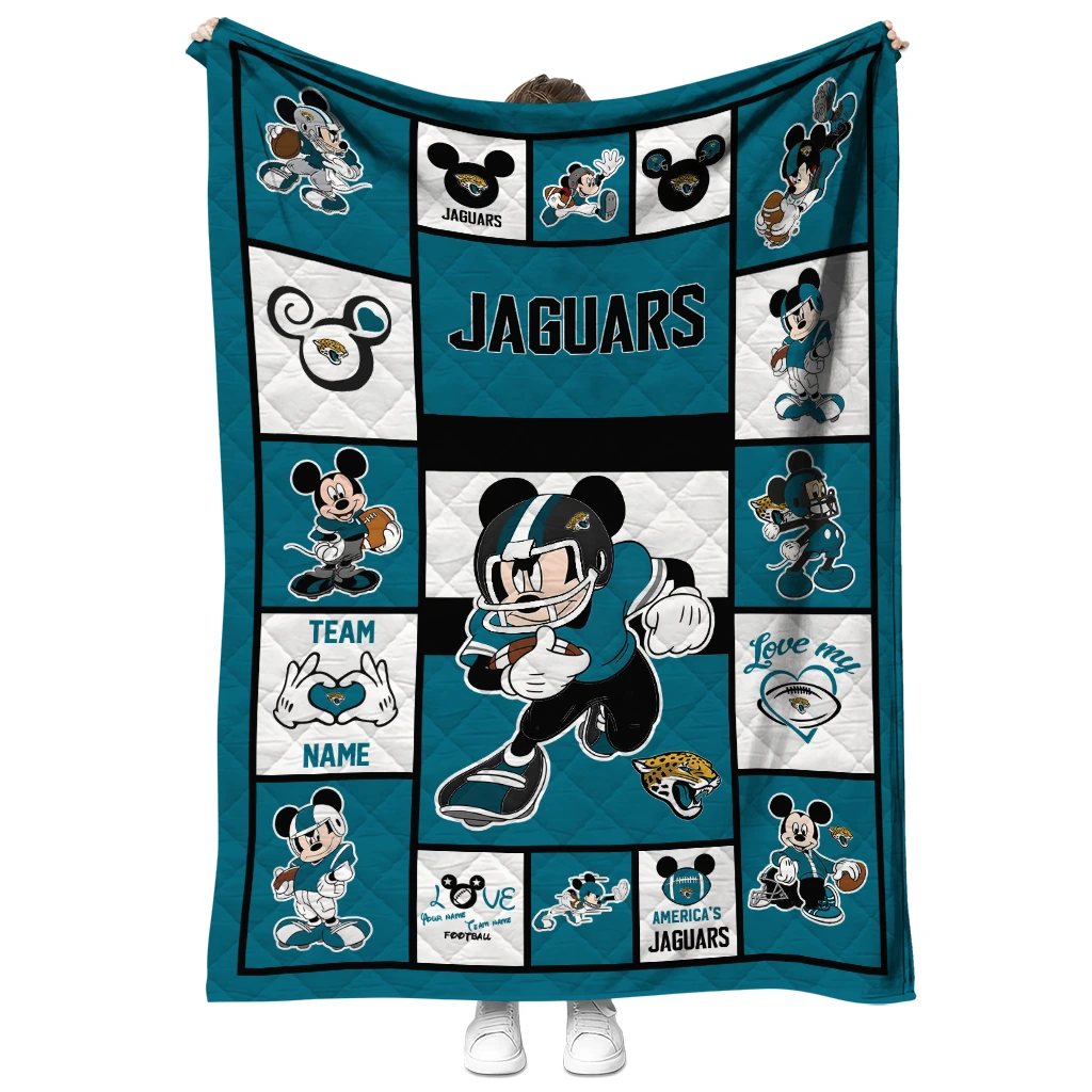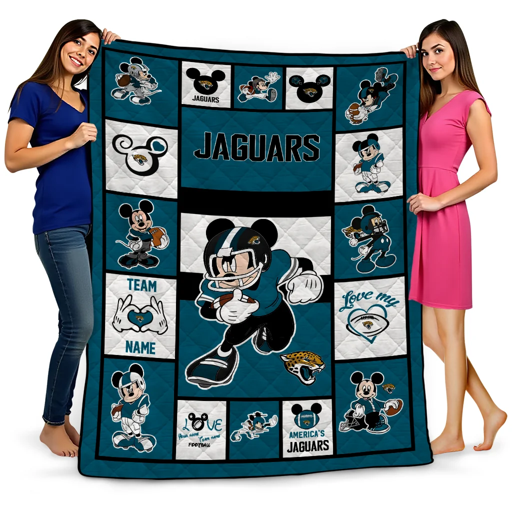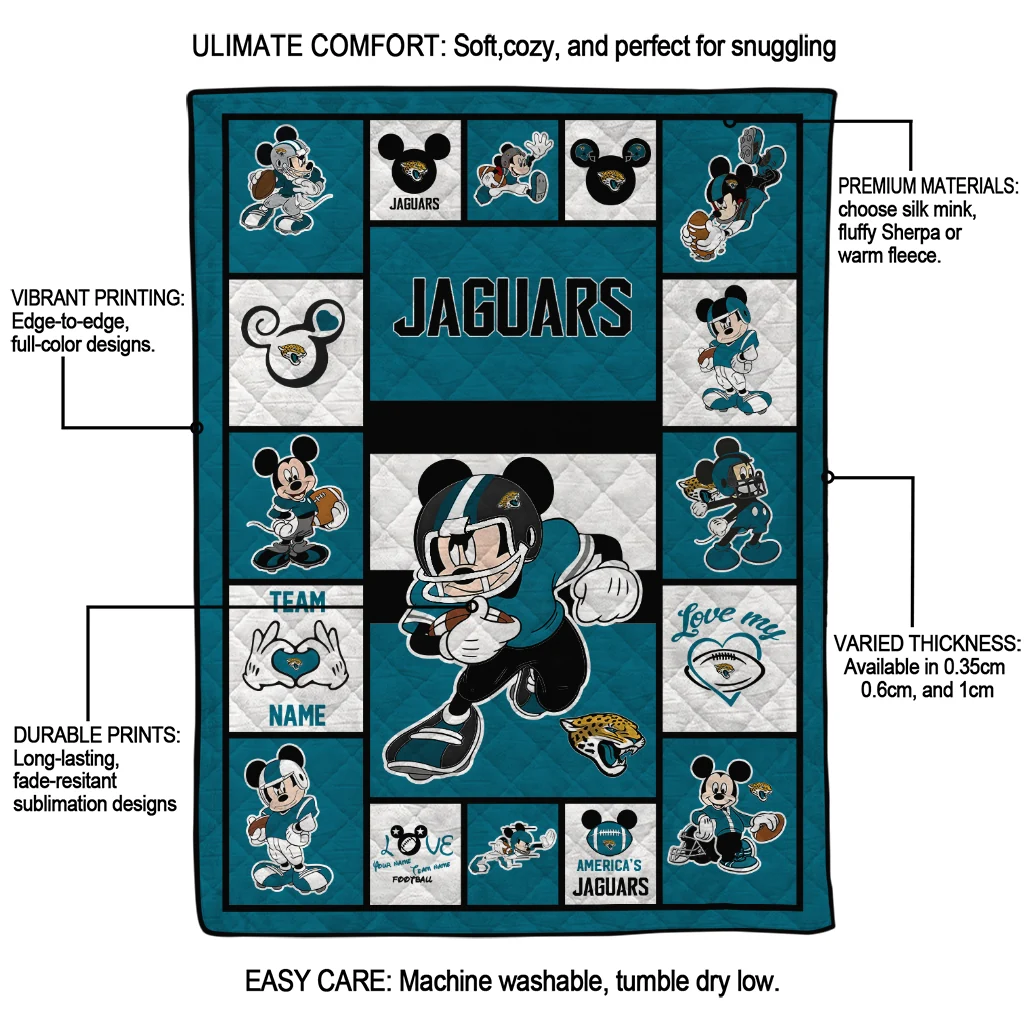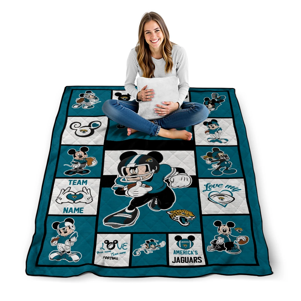 Wrap yourself in warmth and pride with the Customized Jacksonville Jaguars Mickey Crimson Teal White Quilt Blanket from the Jacksonville Jaguars Blankets collection at Yes That Blanket. Made from 100% premium quilting-weight polyester blended with a touch of microfiber, this quilt offers a smooth, soft finish you’ll love. Choose between two quilting styles—Stipple or Diagonal—and enjoy the comfort of a cotton-filled layer inside that adds extra coziness for every season. The border is available in classic black or white, giving your design a clean, timeless edge.