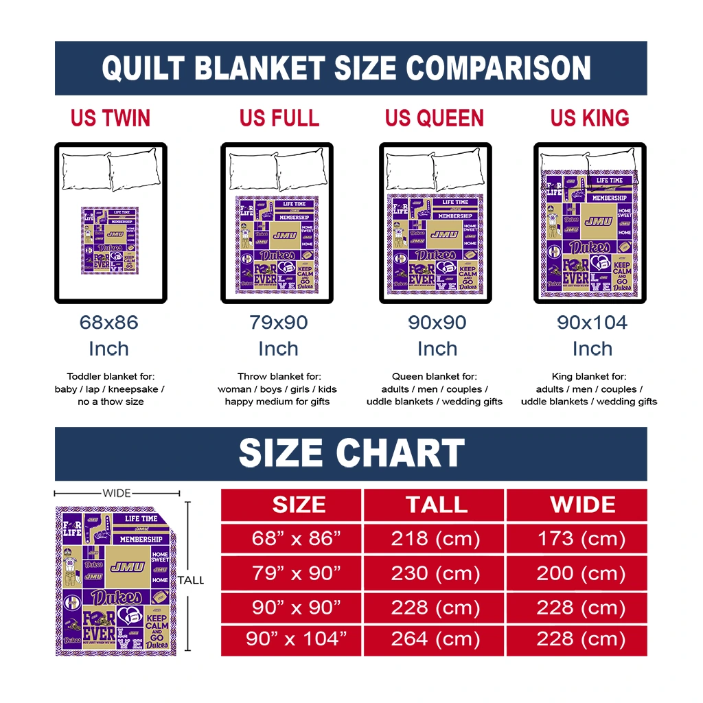 The Customized James Madison Dukes Helmet Passion Purple Quilt Blanket is more than a blanket—it’s everyday comfort, thoughtfully made. Crafted from premium quilting fabric with a soft microfiber touch, it offers a smooth hand-feel and lasting coziness. Layered quilting with a cotton-filled core provides adaptable warmth across seasons while maintaining a clean, tailored look on your bed or sofa.