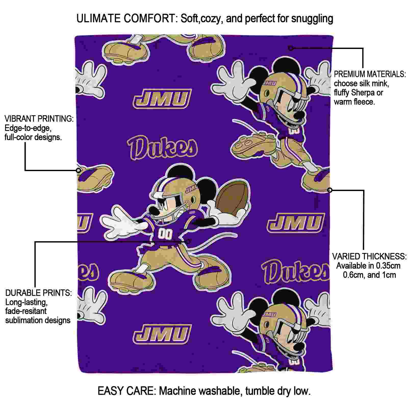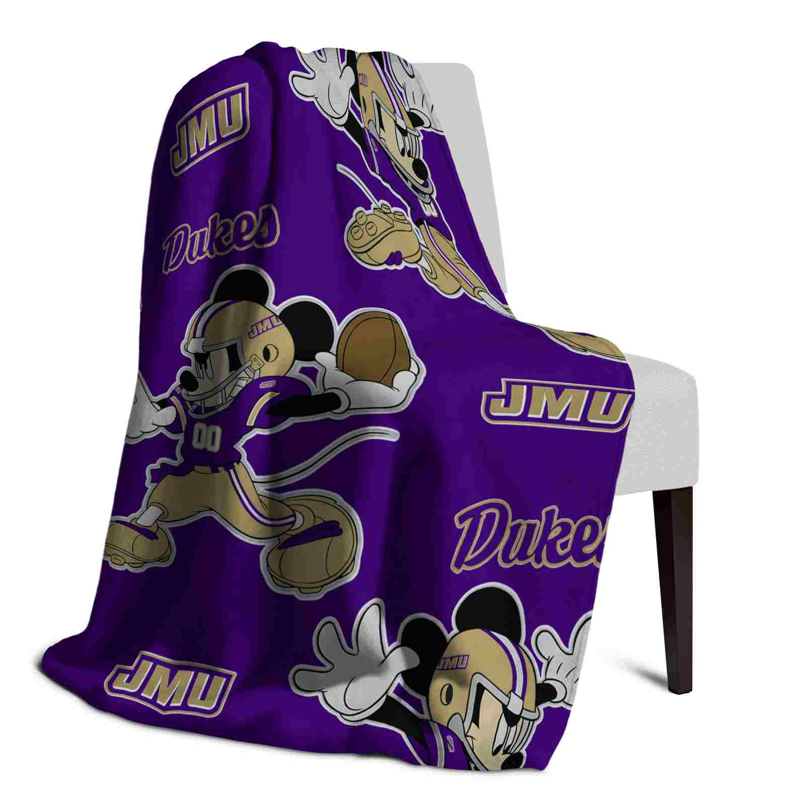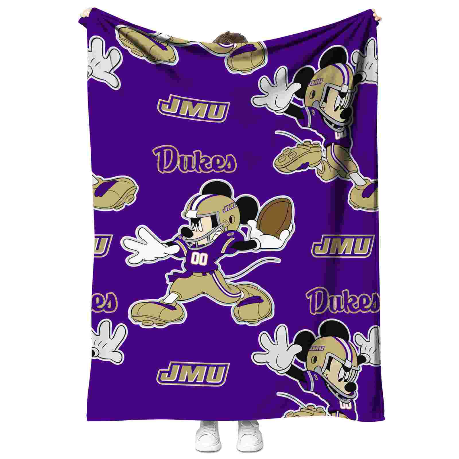 Without a doubt, the Customized James Madison Dukes Mickey Purple Blanket from James Madison Dukes Blankets collection is offering true fans a chance to showcase passion in a cool way. Personalize it with your favorite team's logo or a meaningful name to make it uniquely yours. Isn't that great? The full-color print ensures vibrant, edge-to-edge designs, bringing your sports enthusiasm to life!